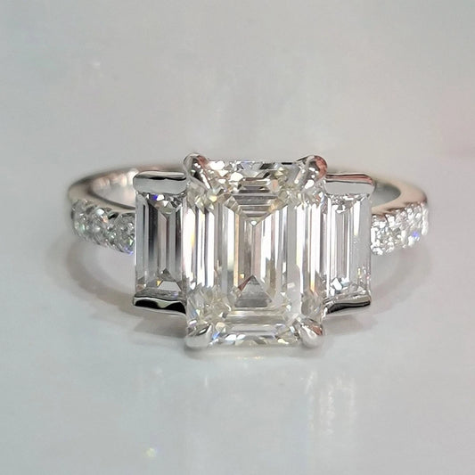 950 Platinum Lab Grown 7.50 CT F/VS IGI Emerald Diamond Trilogy Engagement Ring