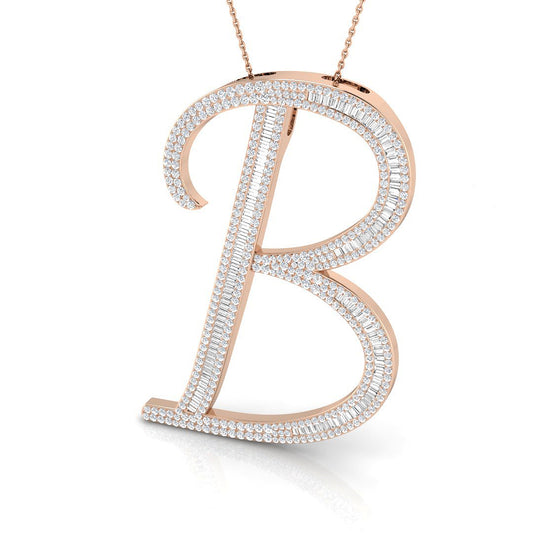 Yellow Gold Diamond Script Initial "B" Pendant with Baguette and Round Diamonds