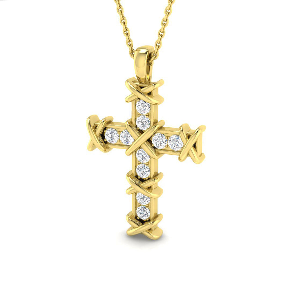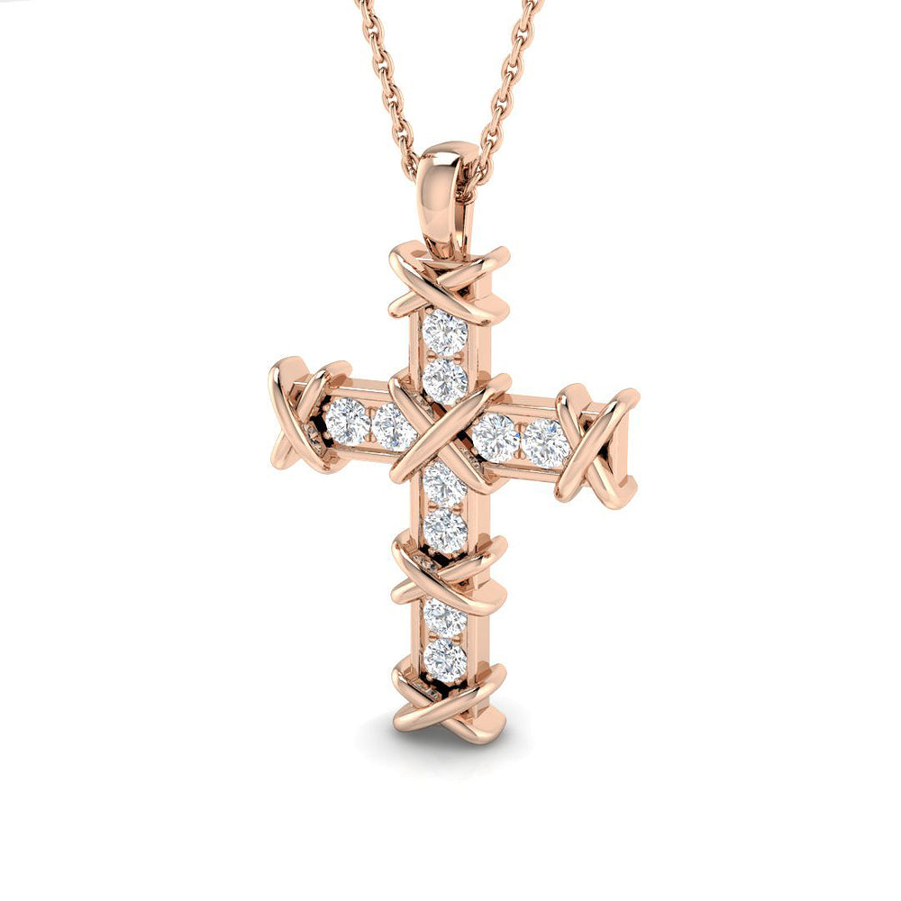Dieser ausdrucksstarke Kreuzanhänger mit 0,30 ct Diamanten vereint auf beeindruckende Weise Glauben und Mode. Die runden Brillanten sind in einer Kanalfassung angeordnet und werden von einer markanten , an Stacheldraht erinnernden Krappenfassung umrahmt, die dem Anhänger zusätzliche Tiefe und Ausdruckskraft verleiht. Handgefertigt in 9- oder 18-karätigem Gold oder Platin Ihrer Wahl, ist dieses Schmuckstück ein kraftvolles Statement für Stärke, Spiritualität und Stil.