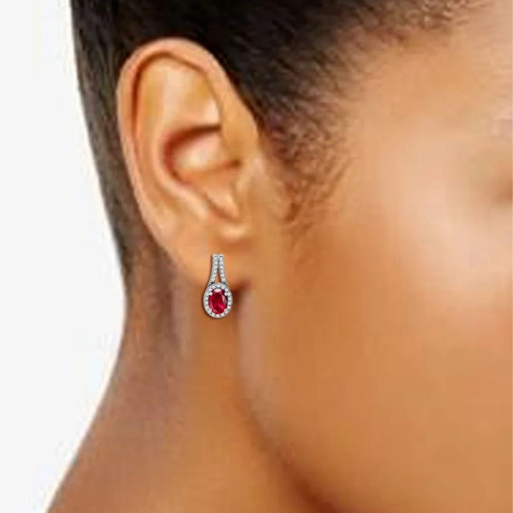 The earrings feature vivid red rubies surrounded by accent diamonds set in 18K white gold. The total diamond weight is 0.30 carats, and the dimensions of the earrings are 17.1mm x 8.1mm. The main stone is a round ruby with a size of 0.45 carats. The diamonds are of H/SI quality, and the setting is a claw setting. The earrings are UK hallmarked and handcrafted, and the diamonds used are conflict-free. Additionally, the earrings are nickel-free. It is mentioned that the weights, gem colors, and sizes are approximate and may vary slightly.