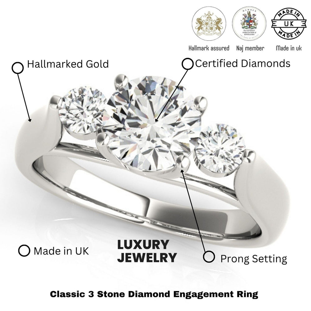 Dieser dreisteinige Verlobungsring mit drei im Labor gezüchteten, runden Diamanten (DE/VS) und einer eleganten Ringschiene ist in 9K, 18K Weißgold, Gelbgold, Roségold und Platin erhältlich. Der Ring ist mit drei atemberaubenden, runden Diamanten besetzt, deren Gesamtkaratgewicht zwischen 0,50 ct und 2,00 ct liegt. Jeder Diamant ist in DE/VS-Qualität gefasst und besticht durch außergewöhnliche Brillanz und minimale Einschlüsse. Das Trilogie-Design symbolisiert Vergangenheit , Gegenwart und Zukunft Ihrer Liebe und macht diesen Ring zu einem eleganten und zeitlosen Schmuckstück.