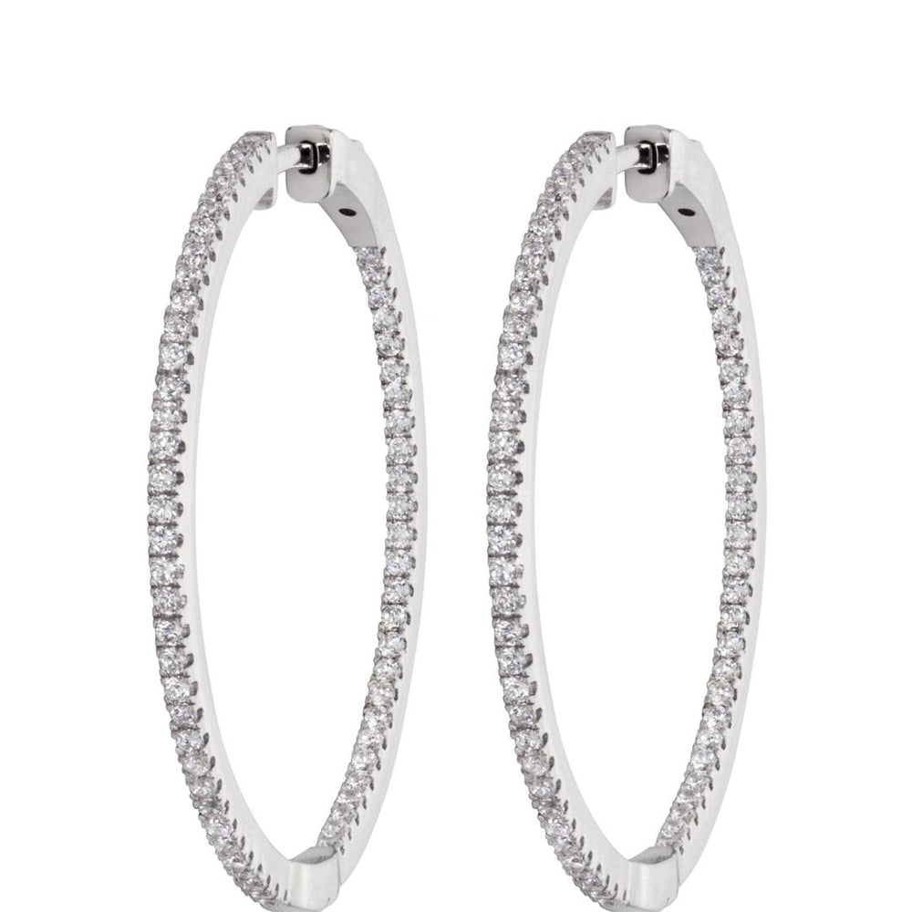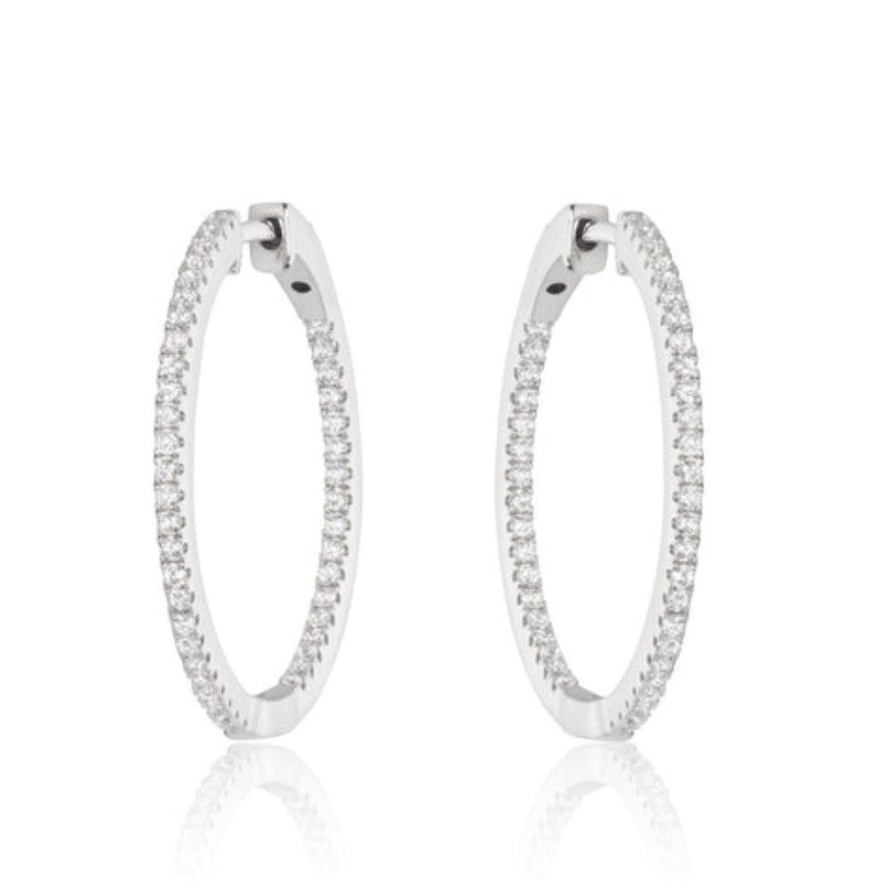 Dieser Text beschreibt ein Paar Diamant-Creolen, die für elegante und glamouröse Anlässe entworfen wurden. Die Ohrringe sind aus 18-karätigem Weißgold gefertigt und mit insgesamt 0,50 Karat hochwertigen Diamanten besetzt. Die Diamanten haben die Reinheitsstufe D/VVS und sind in einer Krappenfassung gefasst. Die Ohrringe haben einen Durchmesser von 30 mm und einen runden Hauptstein. Sie werden in Großbritannien handgefertigt und sind punziert, was ihre Echtheit garantiert. Die verwendeten Diamanten stammen aus konfliktfreien Quellen, und die Ohrringe sind nickelfrei. Es wird darauf hingewiesen, dass Gewicht, Farbe und Größe der Edelsteine ungefähre Angaben sind und leicht variieren können.