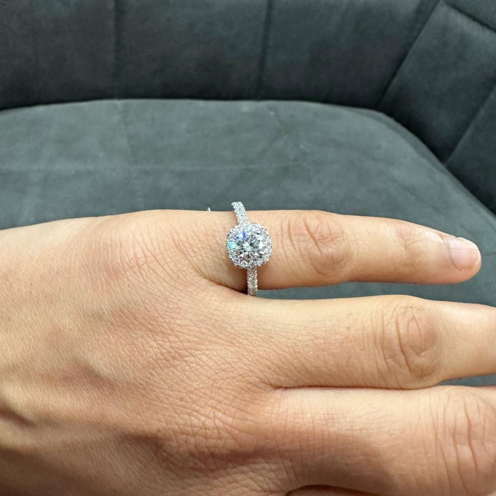 Machen Sie Ihren Heiratsantrag unvergesslich mit diesem atemberaubenden runden Solitär-Verlobungsring mit Halo-Fassung , meisterhaft gefertigt aus elegantem 9-karätigem Weißgold . Das Herzstück bildet ein brillant geschliffener, im Labor gezüchteter Diamant , umgeben von einem funkelnden Halo, der seine Größe, Strahlkraft und sein Feuer noch verstärkt.