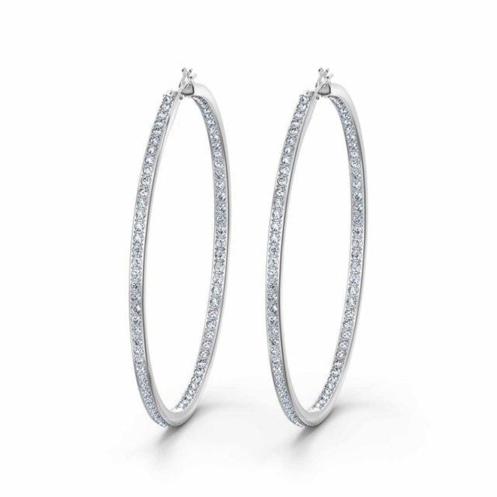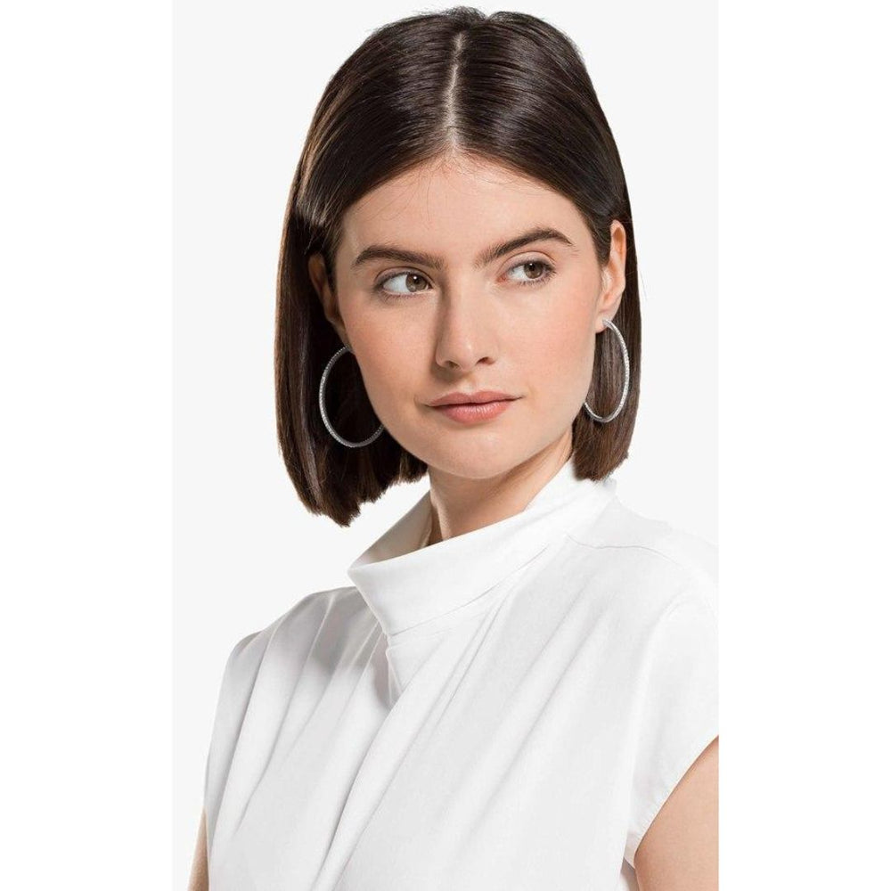Diese handgefertigten Diamant-Creolen sind mit hochwertigen D/VVS-Diamanten besetzt, die in einer Krappenfassung gefasst sind, um maximale Brillanz und Leuchtkraft zu gewährleisten. Das Gesamtgewicht der Diamanten beträgt 1,00 ct, der Durchmesser 50 mm. Der Hauptstein ist rund und in 18-karätigem Weißgold gefasst. Die Ohrringe sind in Großbritannien punziert und werden aus konfliktfreien Diamanten und nickelfreien Materialien gefertigt. Bitte beachten Sie, dass Gewicht, Farbe und Größe der Edelsteine ungefähre Angaben sind und leicht variieren können.