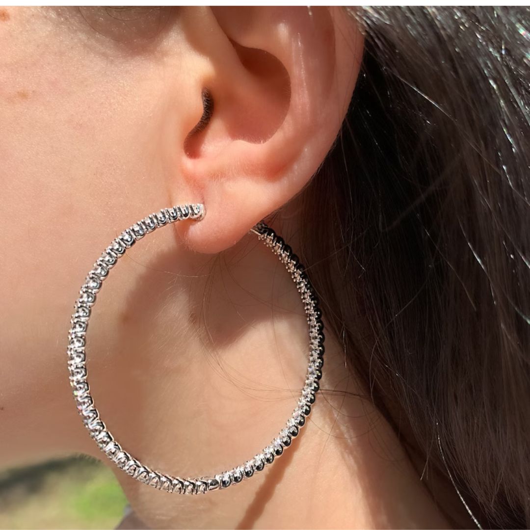 These are 1.00 carat to 7.00 carat Lab Diamond Hoop Earrings made of 9K White Gold with G/VS quality lab-grown diamonds. The diamonds are set in recycled 9K white gold, with each round diamond securely placed in individual settings around the entire hoop, creating a beautiful sparkle with every movement. The earrings are designed to be lightweight and comfortable for daily wear, with a high-quality clasp to keep them secure. Diamond hoops are a timeless classic and can be a special gift for a loved one or a treat for yourself.