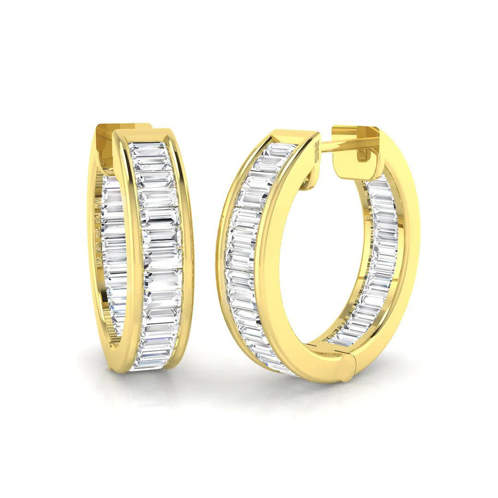 Verleihen Sie Ihrer Schmucksammlung mit diesen atemberaubenden Ohrringen mit Baguette-Diamanten einen Hauch von Luxus und Eleganz. Erhältlich in 9- oder 18-karätigem Weißgold, Gelbgold, Roségold oder Platin , vereinen diese Ohrringe Eleganz und Langlebigkeit. Die Zargenfassung hält die Diamanten sicher und sorgt für ein schlankes, modernes Design, das das Licht wunderschön einfängt.