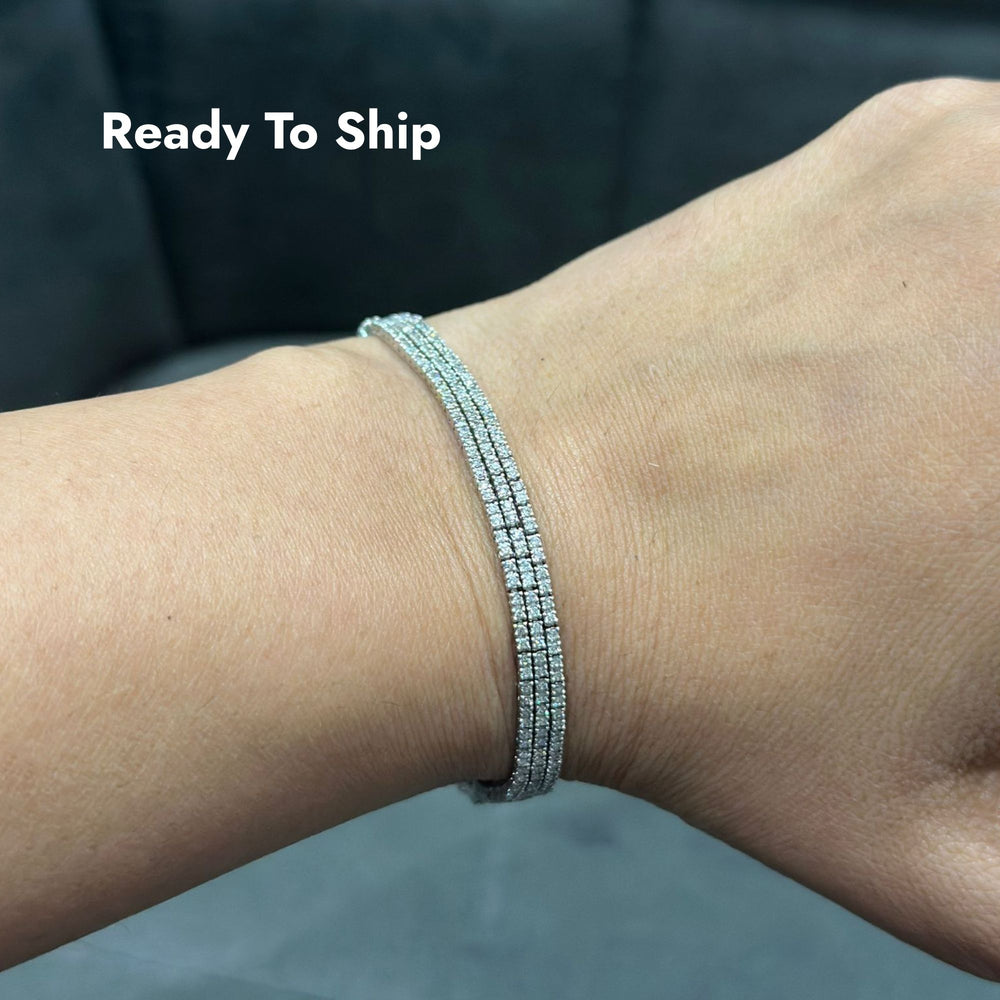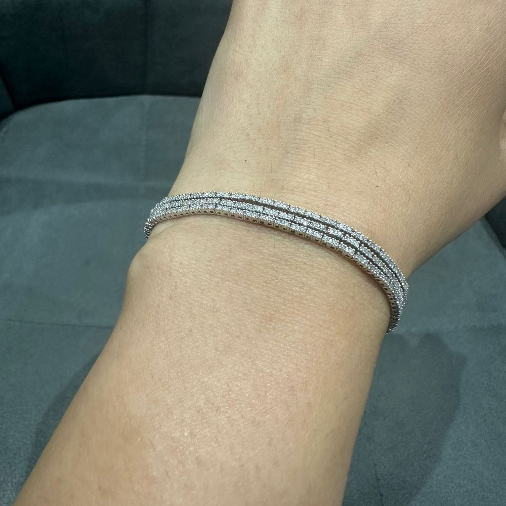Bereichern Sie Ihre Schmucksammlung mit diesem atemberaubenden Tennisarmband mit drei Reihen natürlicher Diamanten , das in luxuriösem 14-karätigem Weißgold kunstvoll gefertigt ist. Drei durchgehende Reihen runder, brillantgeschliffener Naturdiamanten verleihen diesem Armband außergewöhnliches Funkeln und Eleganz – perfekt für Frauen, die kühne Eleganz und zeitlose Schönheit schätzen.