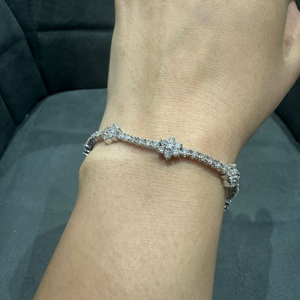Jedes Cluster besteht aus mehreren runden Brillanten und erzeugt so ein blütenartiges Funkeln, das das Licht aus jedem Winkel einfängt. Mit Diamanten der Farbstufe GH und der Reinheitsstufe SI besticht das Armband durch nahezu farblose Strahlkraft, wunderschönes Feuer und Klarheit und eignet sich daher sowohl für glamouröse Anlässe als auch für den eleganten Alltag.