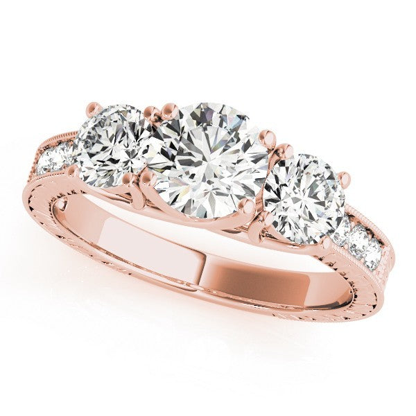 Dieser Verlobungsring mit drei im Labor gezüchteten, runden Diamanten (DE/VS) ist in eine kunstvoll gearbeitete Art-déco-Ringschiene mit Milgrain-Verzierung gefasst und in 9-karätigem und 18-karätigem Weiß-, Gelb- und Roségold sowie Platin erhältlich. Das Trilogie-Design präsentiert drei atemberaubende, runde Diamanten mit einem Gesamtgewicht von 0,50 ct bis 2,00 ct , die Vergangenheit , Gegenwart und Zukunft Ihrer Liebe symbolisieren. Die Art-déco-Ringschiene ist mit aufwendigen Milgrain-Verzierungen versehen, die der zeitlosen Trilogie-Fassung einen Hauch von Vintage verleihen.