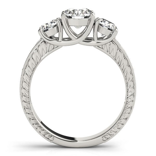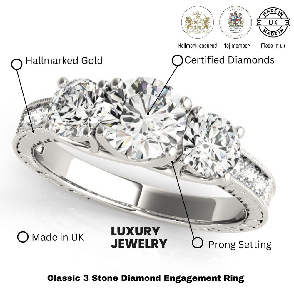 Dieser Verlobungsring mit drei funkelnden, im Labor gezüchteten Diamanten (DE/VS) im Brillantschliff präsentiert drei strahlende, runde Diamanten , die jeweils einen wichtigen Teil Ihrer Liebesgeschichte symbolisieren: die Vergangenheit , die Gegenwart und die Zukunft . Das dreisteinige Design wird durch eine elegante Ringschiene im Art-déco- Stil mit Milgrain-Verzierung perfekt ergänzt und vereint Vintage- Charme mit zeitloser Eleganz .