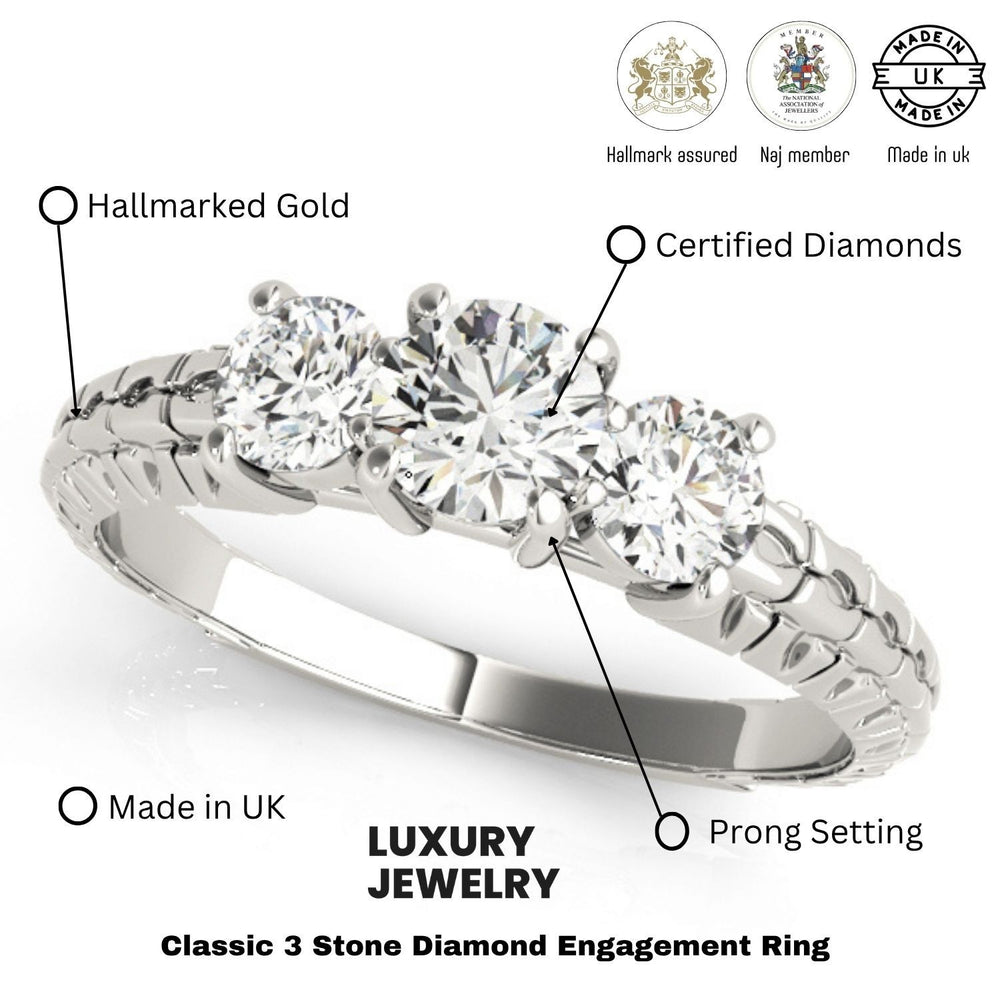 Dieser Verlobungsring mit drei Steinen eignet sich perfekt für Verlobungen , besondere Anlässe oder als zeitloses Geschenk . Er ist vom britischen Prüfamt punziert , was seine Echtheit und erstklassige Verarbeitung garantiert.