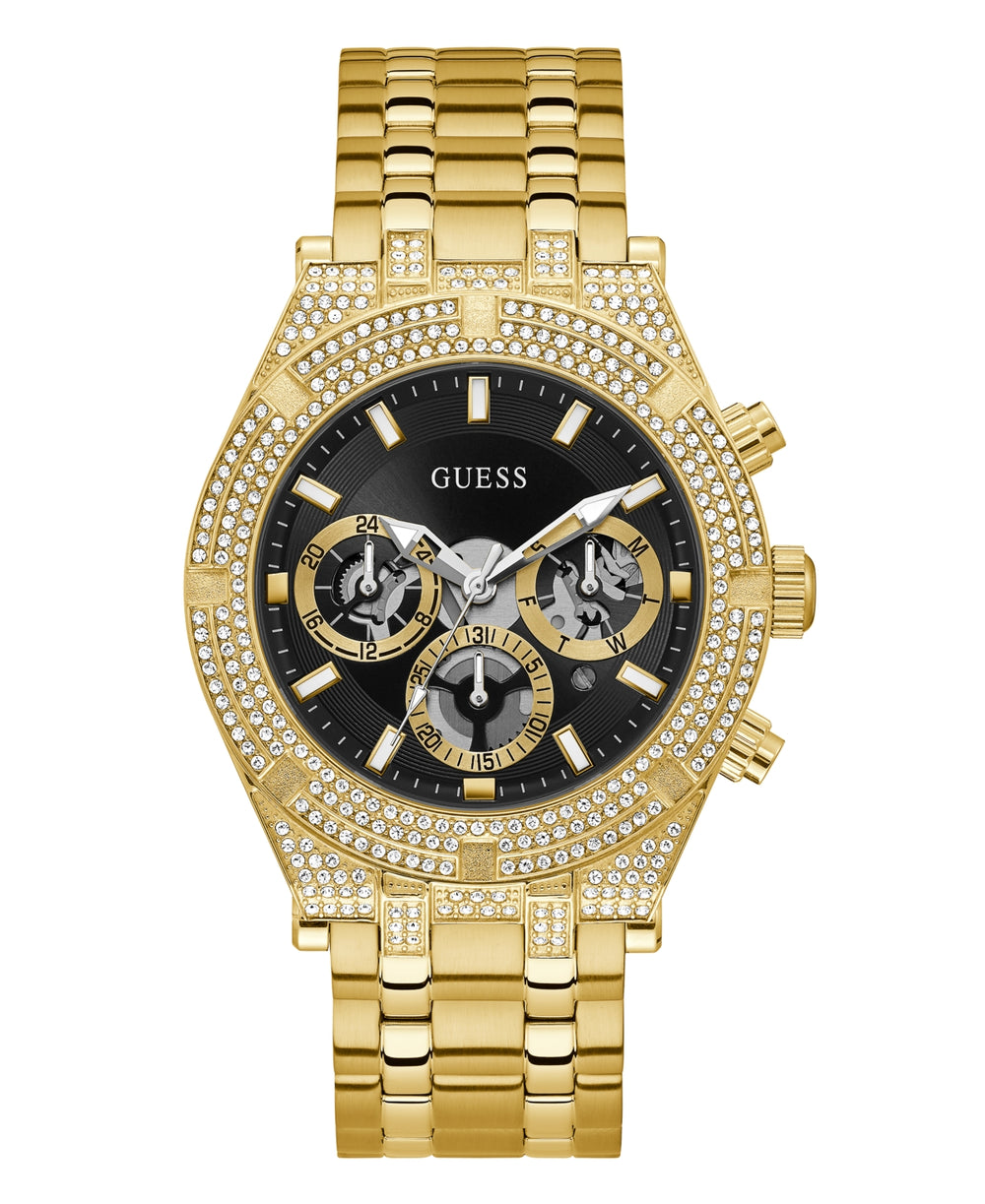The GUESS Men's Gold-Tone Glitz Stainless Steel Bracelet Multi-Function Watch (Model GW0455G2) is the epitome of luxury and style. Featuring a gold-tone stainless steel case encrusted with 346 sparkling crystals on the bezel, this watch combines elegance and functionality in a bold, striking design. The chrono-look multi-function movement offers a sophisticated display with day, date, and 24-hour subdials.