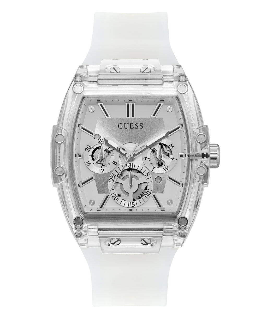 The GUESS Men's Multi-Function Transparent and Silver-Tone Silicone Strap Watch (Model GW0203G1) takes your style to new heights with its sleek transparent dial and visible gears. The 43mm case and silver-tone silicone strap create a modern, industrial look, while the multi-function quartz movement offers precision and reliability.