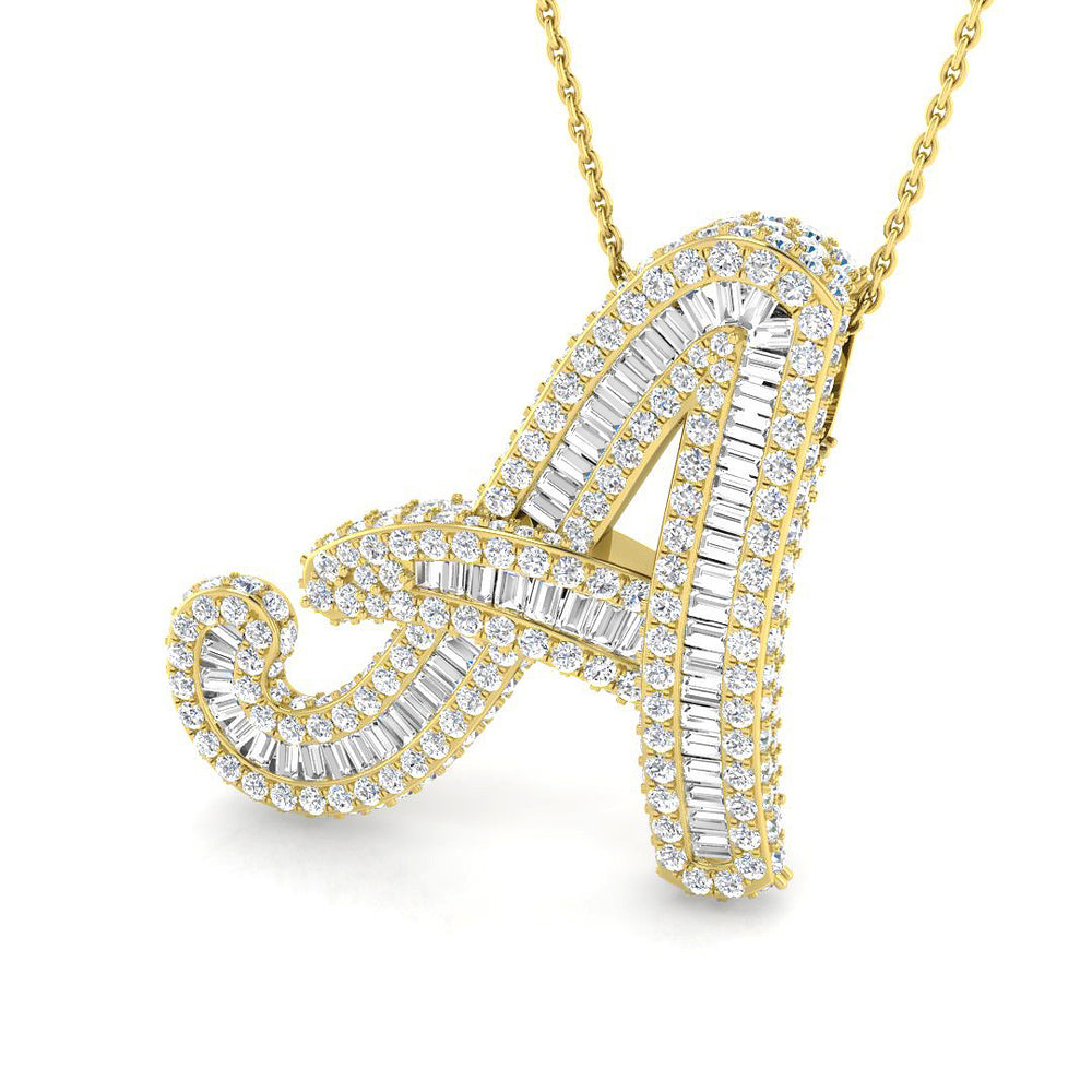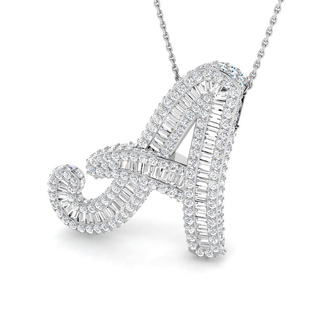 Weißgoldener Diamantanhänger mit dem Anfangsbuchstaben „A“ – Verleihen Sie Ihrer Schmucksammlung einen Hauch von Luxus und Eleganz mit diesem Anhänger in Form eines eleganten „A“ aus Weißgold mit Diamanten. Der Anhänger besticht durch eine wunderschöne Kombination aus Baguette- und Rundschliffdiamanten und ist ein echtes Schmuckstück.