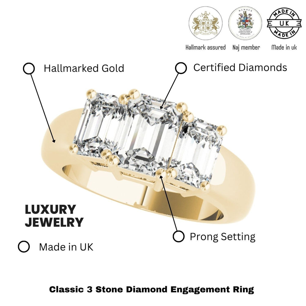 Dieser zeitlose Verlobungsring mit drei im Labor gezüchteten Diamanten (DE/VS) verkörpert schlichte Eleganz und Symmetrie. Ein smaragdgeschliffener Mittelstein wird von zwei passenden smaragdgeschliffenen Seitensteinen ergänzt. Das Design fängt die Klarheit und Anmut von Stufenschliff-Diamanten in einer raffinierten Dreisteinanordnung ein. Die klassische Krappenfassung verstärkt die Brillanz und hält jeden Stein mit einer minimalistischen, aber dennoch robusten Verarbeitung sicher.