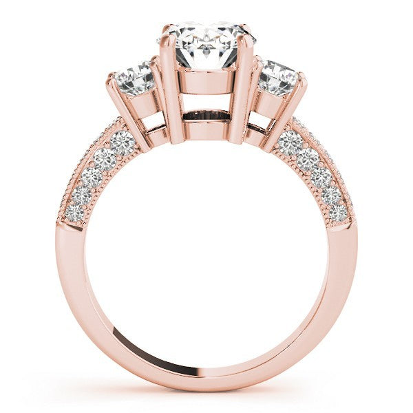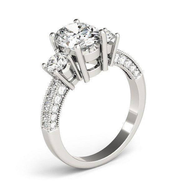 This elegant DE/VS Lab Grown Diamond Engagement Ring showcases a brilliant blend of timeless design and vintage charm. A graceful oval-cut center diamond is flanked by two round-cut side diamonds, enhanced by intricate milgrain detailing and subtle Art Deco-inspired craftsmanship. The trilogy layout represents your past, present, and futureâmaking it a beautiful choice for a proposal or celebration of enduring love.