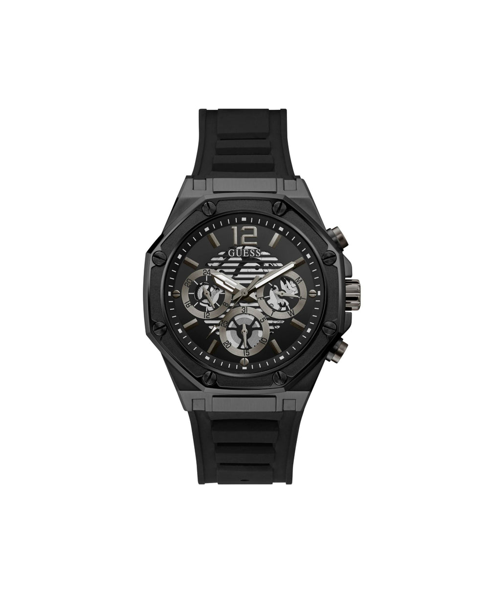 The GUESS Men's Black Multifunction Watch (Model GW0263G4) combines bold style and functional elegance. Featuring a black stainless steel case and a comfortable black silicone strap, this timepiece is designed for the modern man who values both sophistication and performance. The black dial is enhanced by day, date, and 24-hour subdials, offering practicality in a sleek, minimalist design.