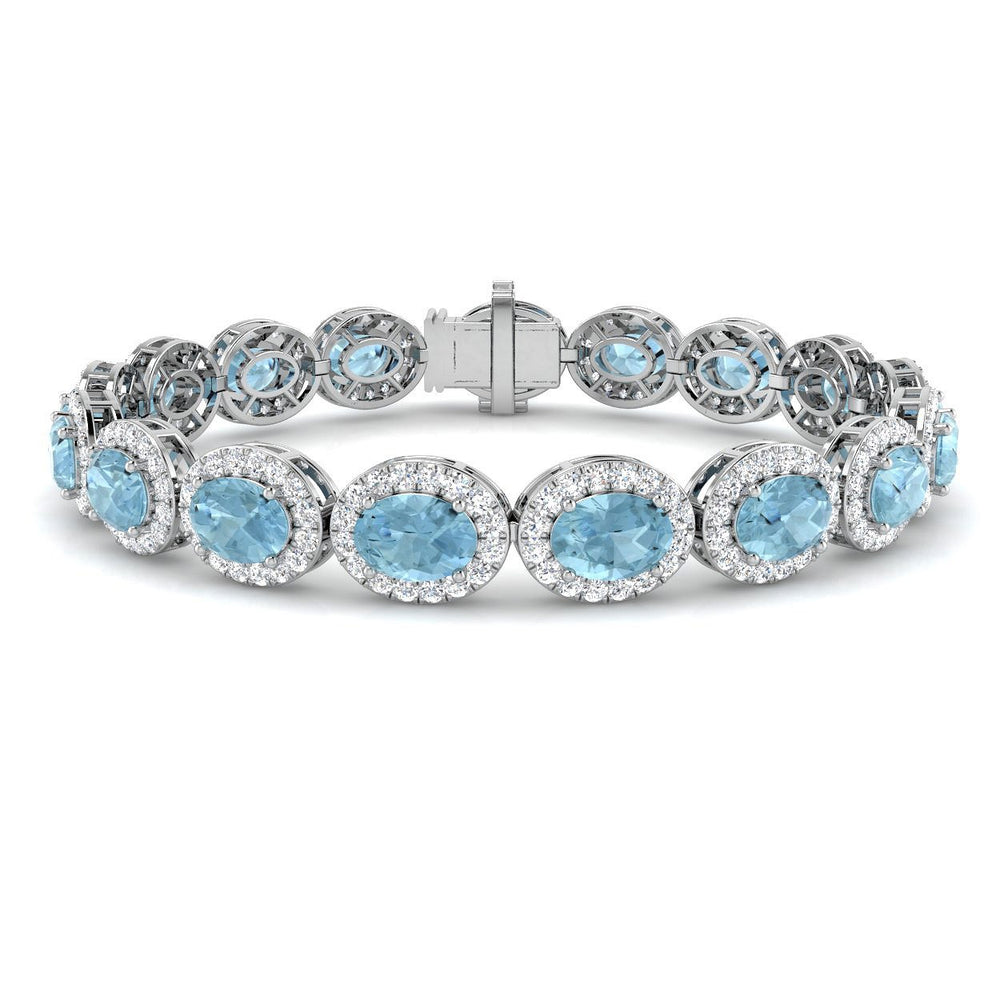 Experience elegance in its purest form with this breathtaking Aquamarine and Diamond Halo Tennis Bracelet, masterfully crafted in 18K White Gold. Each link showcases a stunning oval-cut Aquamarine gemstone totaling 11.97 carats, beautifully encircled by a halo of natural round diamonds weighing 3.24 carats in total. The diamonds, in G color and SI2 clarity, are prong-set to amplify brilliance and create a dazzling frame around each serene blue Aquamarine.