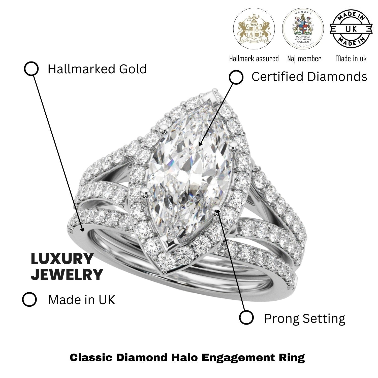 Available in 9K, 18K White, Yellow, Rose Gold, or Platinum, with total diamond weights ranging from 1.50Ct to 3.00Ct, each ring is handcrafted in the UK and hallmarked by the UK Assay Office for guaranteed quality and authenticity.