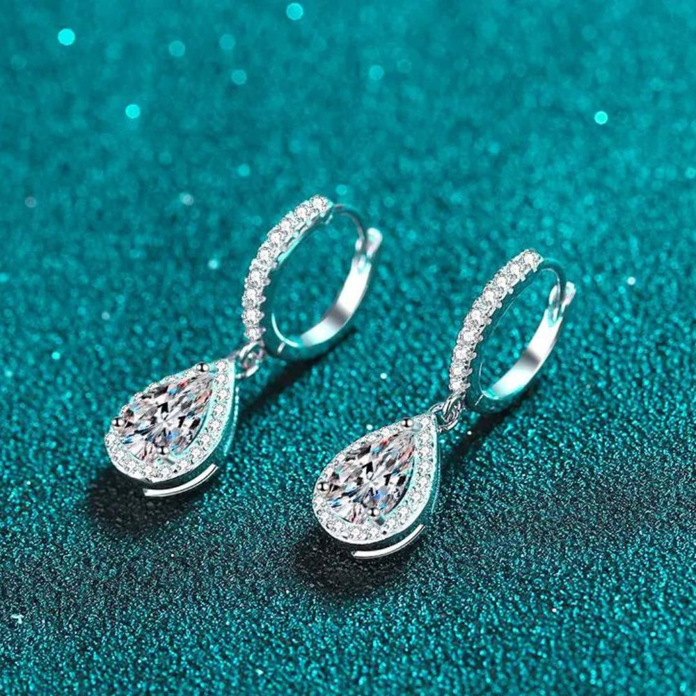 These stunning diamond drop earrings feature a halo design inspired by the classic pear-shaped diamond cut. Made of polished white gold, they are elegant and radiant. The secure clasps are adorned with diamonds for a high-quality finish.