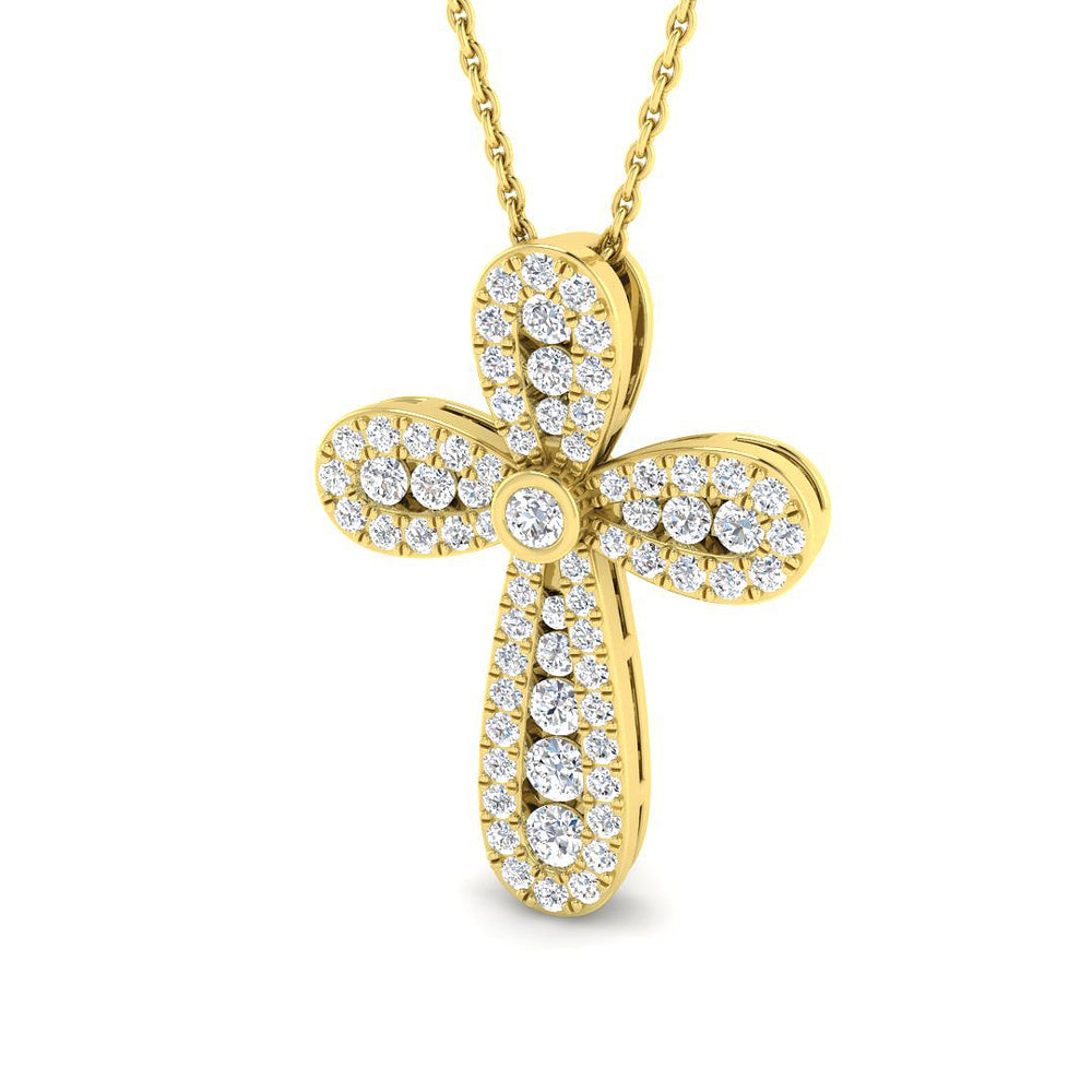 This elegant cross pendant features a contemporary, rounded silhouette, beautifully adorned with pavé-set round brilliant diamonds along each arm. A bezel-set round diamond at the center adds a focal point of brilliance. The softly curved edges give the pendant a refined, feminine charm. Handcrafted in 9K / 18K gold or platinum, this piece blends modern design with timeless elegance.