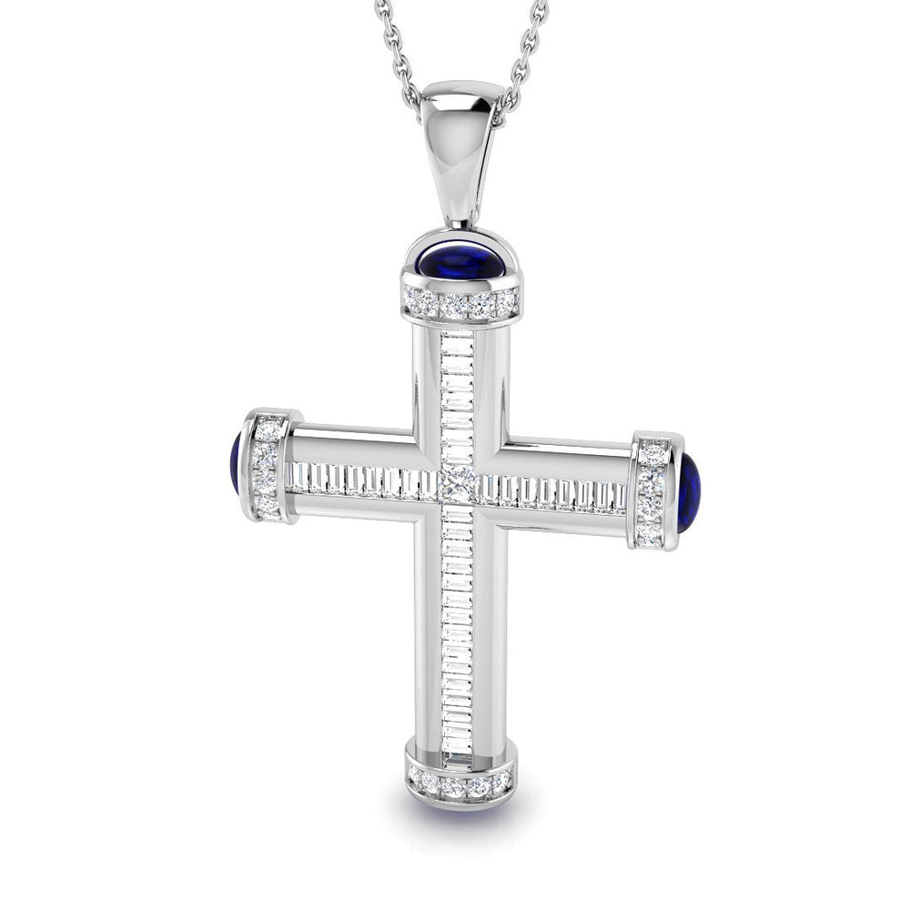 This exquisite cross pendant is a masterpiece of fine craftsmanship, combining the brilliance of diamonds with the rich hue of blue sapphires. The cross arms feature baguette-cut diamonds bordered by round brilliants, while a single princess-cut diamond graces the center. At each tip, a cabochon-cut AA blue sapphire adds a regal touch. Handcrafted in 9K / 18K gold or platinum, this pendant blends classic symbolism with luxury design.
