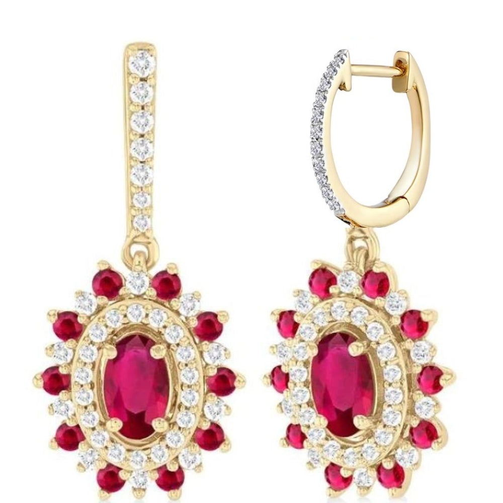 The earrings feature a drop design made of yellow gold, with a combination of rubies and lab-grown diamonds that create a stunning and elegant look. The diamonds are described as sustainable and lab-grown, offering both ethical sourcing and good value for money. The earrings are highlighted as a perfect gift for any occasion.