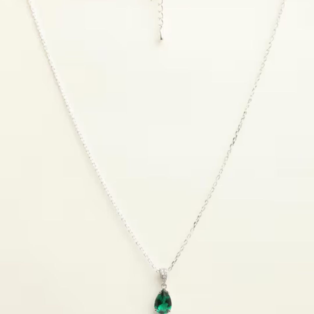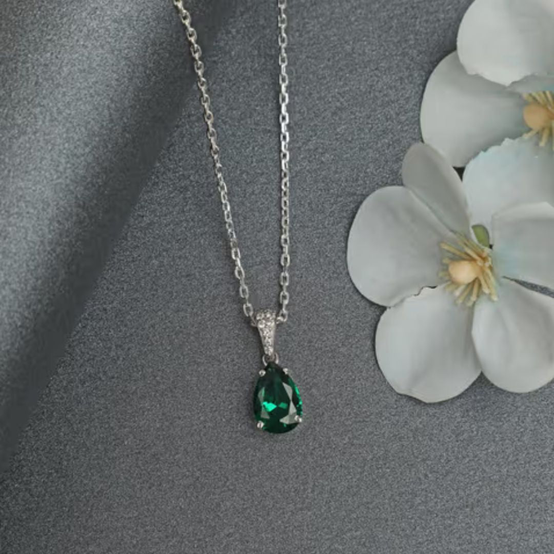 This description is about a necklace called the Lab Emerald and Diamond Solitaire Pear Cut Necklace. It features a lab-grown 2.40ct emerald and 0.08ct of H/SI quality diamonds set in sterling silver. The necklace has a modern touch with smaller diamonds scattered along its length. The main emerald is showcased beautifully with minimal claws around it. This necklace is suitable for all occasions and makes a great gift, especially for those born in May.