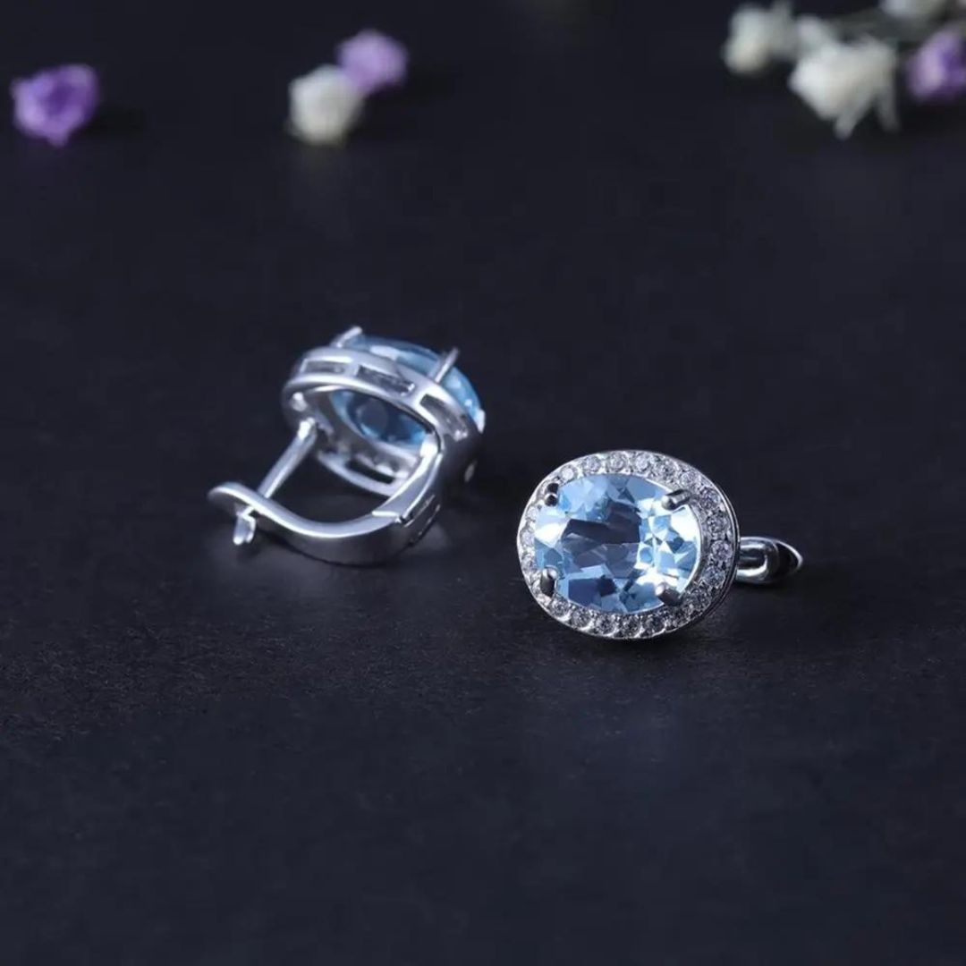 The earrings feature oval cut aquamarine solitaires totaling 3.69 carats, surrounded by Premium Quality Diamonds. The total diamond weight is 0.12 carats. The dimensions of the earrings are 14mm x 11mm. The main stone is aquamarine, shaped in oval, set in 9K white gold with a claw setting. The earrings are UK hallmarked, handcrafted in the UK, and made with conflict-free and nickel-free diamonds. It is mentioned that weights, gem colors, and sizes are approximate and may vary slightly.