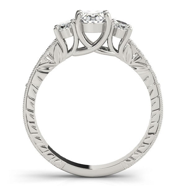 This Oval Trilogy Engagement Ring is a harmonious blend of vintage glamour and modern elegance. A radiant lab-grown oval-cut center diamond is gracefully framed by two matching oval-cut side stones, forming a seamless and symmetrical trio. Fine milgrain beading along the edges adds refined detail, while Art Deco styling brings nostalgic charm to the design.