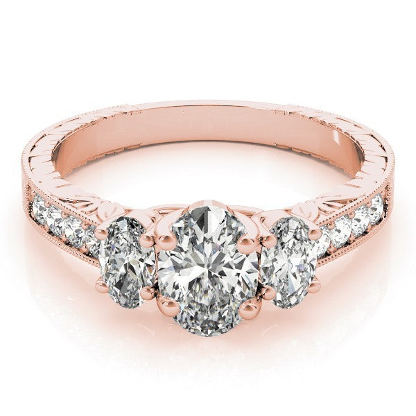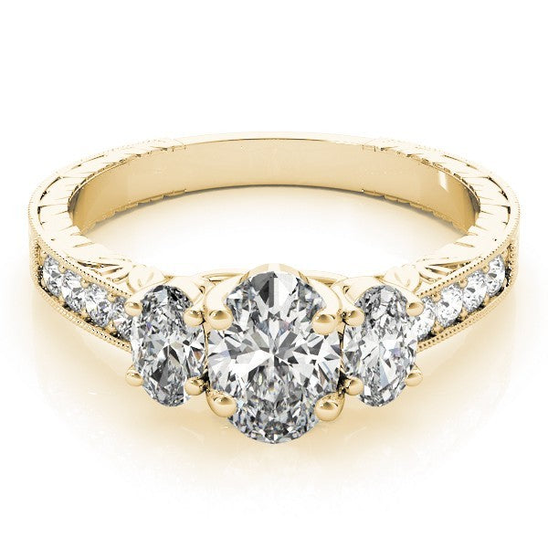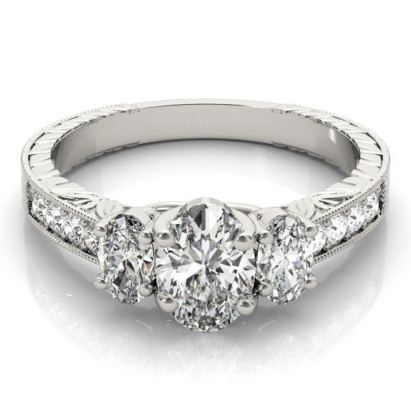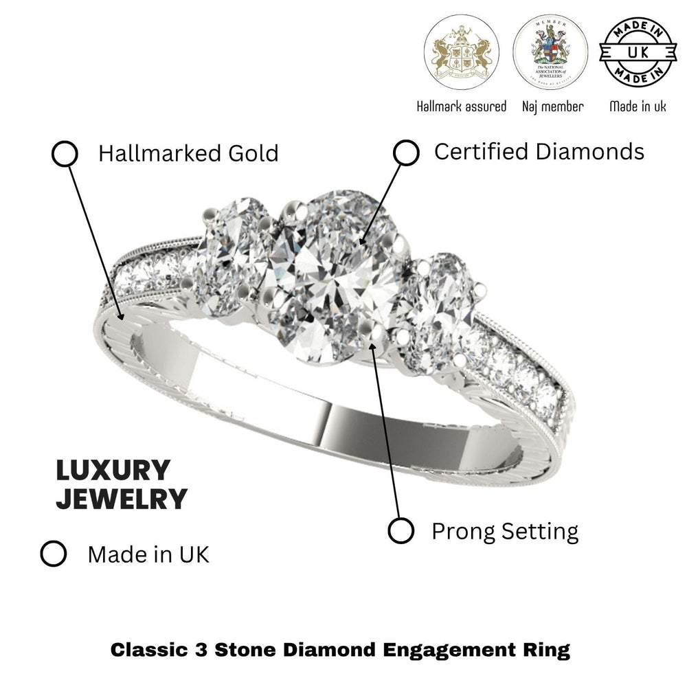 This elegant DE/VS Lab Grown Diamond Engagement Ring is a graceful expression of vintage charm and timeless romance. Featuring an oval-cut center diamond flanked by two matching oval-cut side diamonds, the design is elevated with fine milgrain detailing and subtle Art Deco influences. A true symbol of the past, present, and future — perfect for engagements or anniversaries.