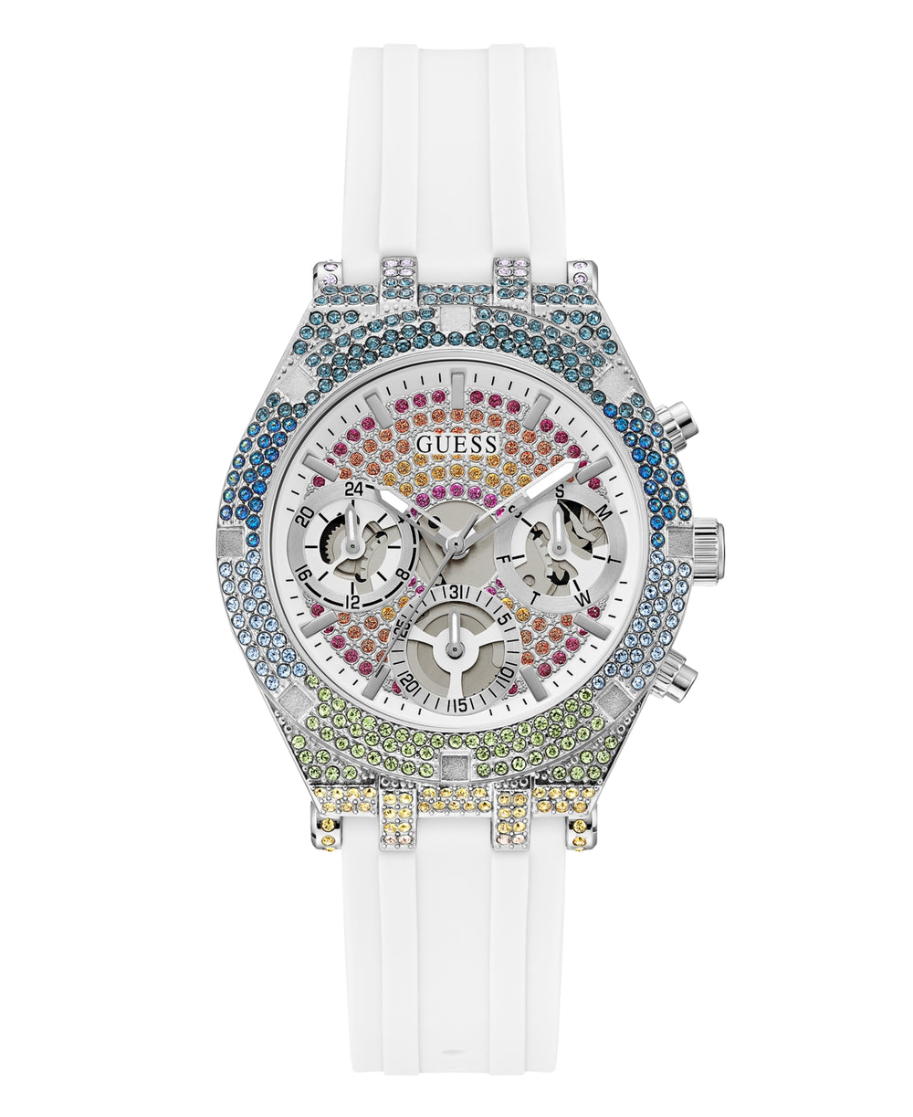Elevate your look with the Guess Women's Multifunction White Stainless Steel Watch GW0407L4, a dazzling timepiece that radiates luxury and sophistication. Featuring a sleek 38mm white stainless steel case and bracelet, this watch is beautifully adorned with up to 300 rainbow crystals that sparkle with every movement.