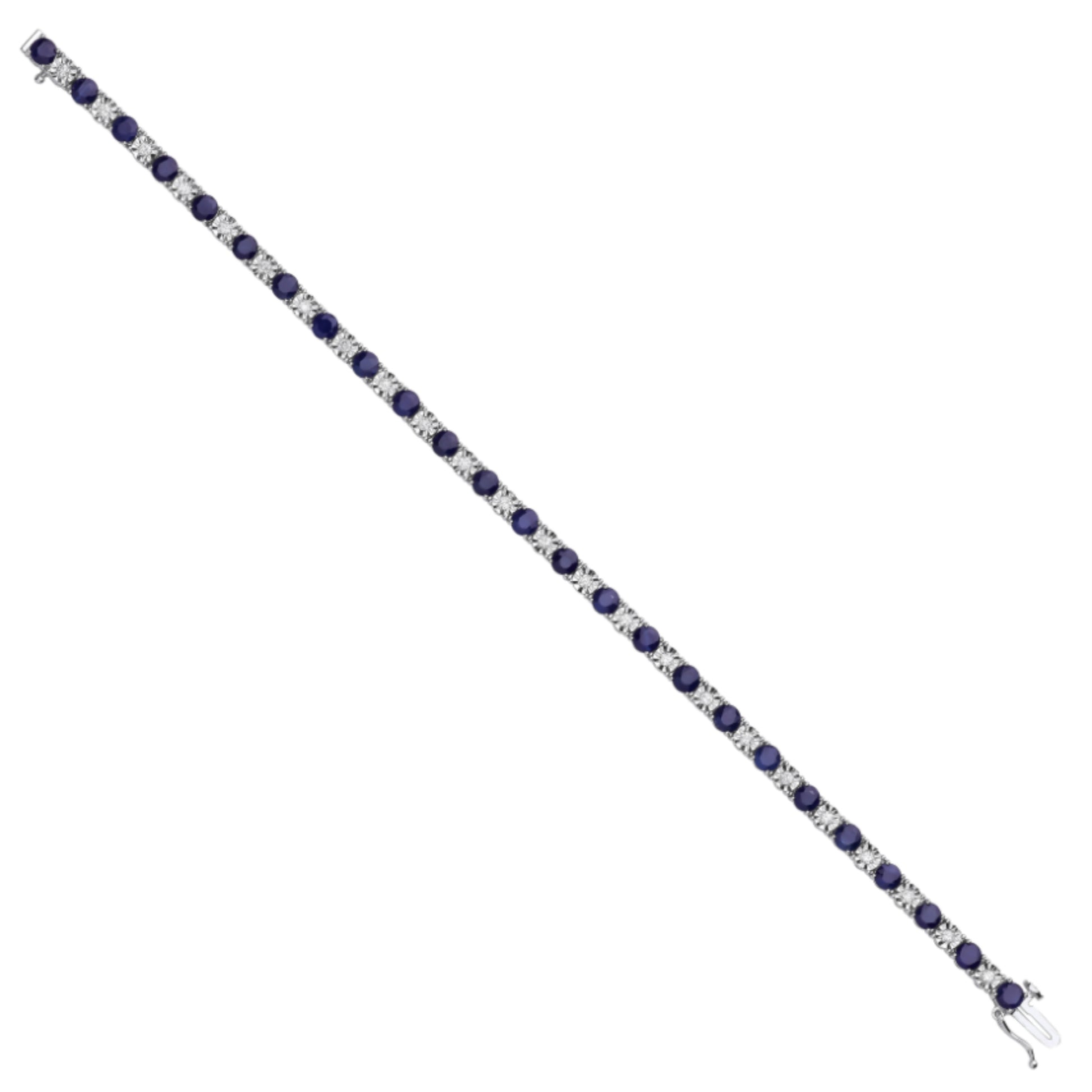 The elegant tennis-style design offers a perfect harmony between deep blue sapphires and radiant white diamonds, making it ideal for both everyday sophistication and special occasions. Secured with a box clasp and dual safety locks, this bracelet ensures lasting comfort and security while maintaining a sleek, luxurious appearance.