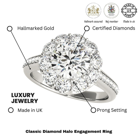 2.00 Carat Lab Grown Round Cut Diamond Halo Engagement Ring 18K White Gold