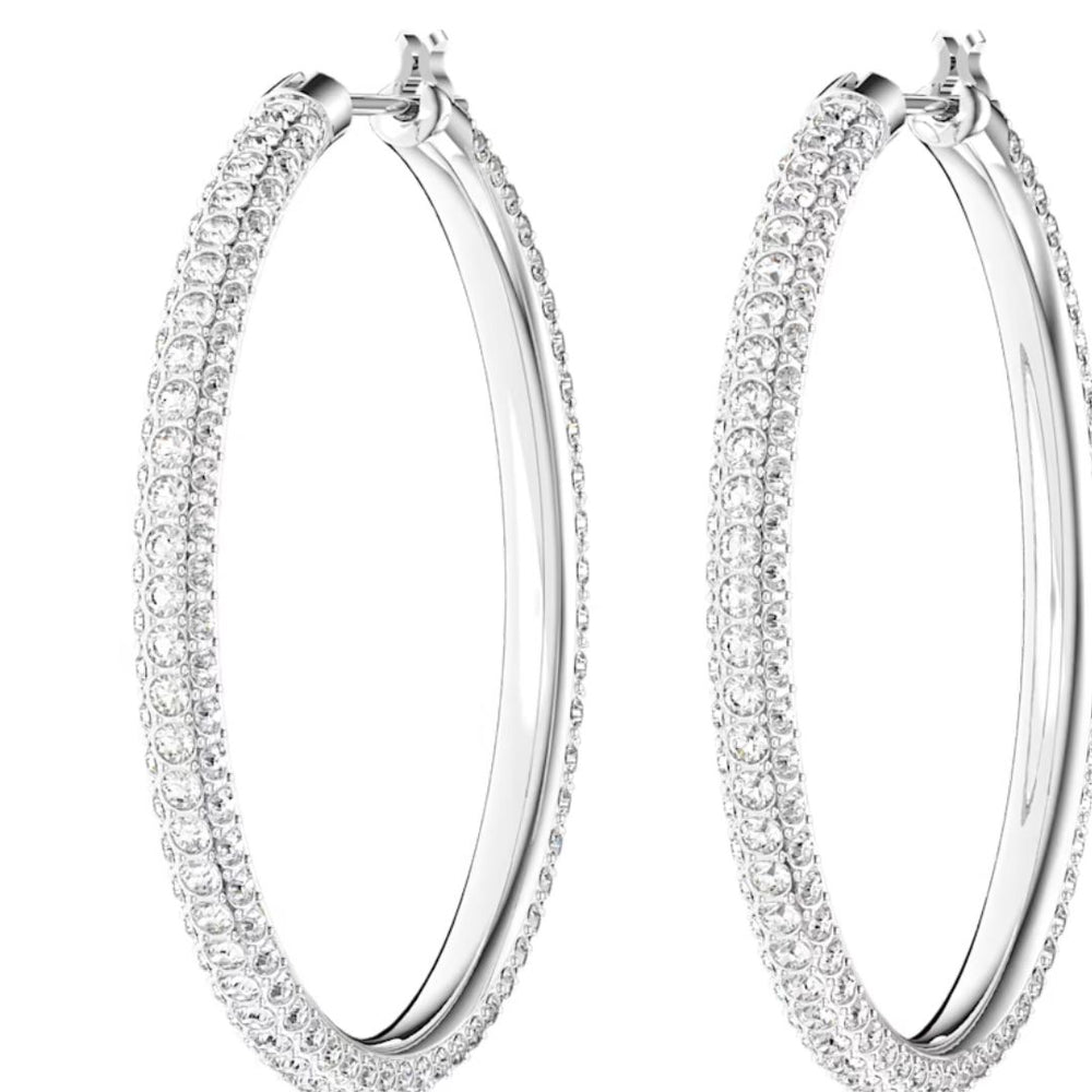 This passage is describing a pair of hoop earrings that are designed to accentuate your features with a touch of glamour. The earrings are made of sterling silver and feature dainty diamonds set in a claw setting. The total diamond weight is 0.10 carats, and the main stone shape is round. The earrings are UK handcrafted and are nickel-free. The diamonds used are conflict-free, ensuring ethical luxury. The earrings are versatile, suitable for both daytime and evening wear. The product specifications indicate the dimensions of the earrings as 35mm x 1mm. Please note that weights, gem colors, and sizes are approximate and may vary slightly.