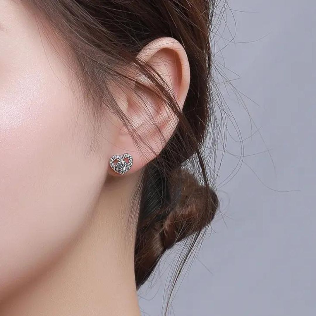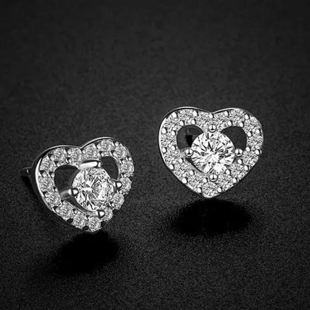 This passage describes a pair of diamond stud earrings made by master jewellers. The earrings feature a heart-shaped halo design and are described as being romantic and versatile, suitable for wearing with any outfit. They are also said to be an ideal gift for various occasions and are available with a matching ring and necklace.