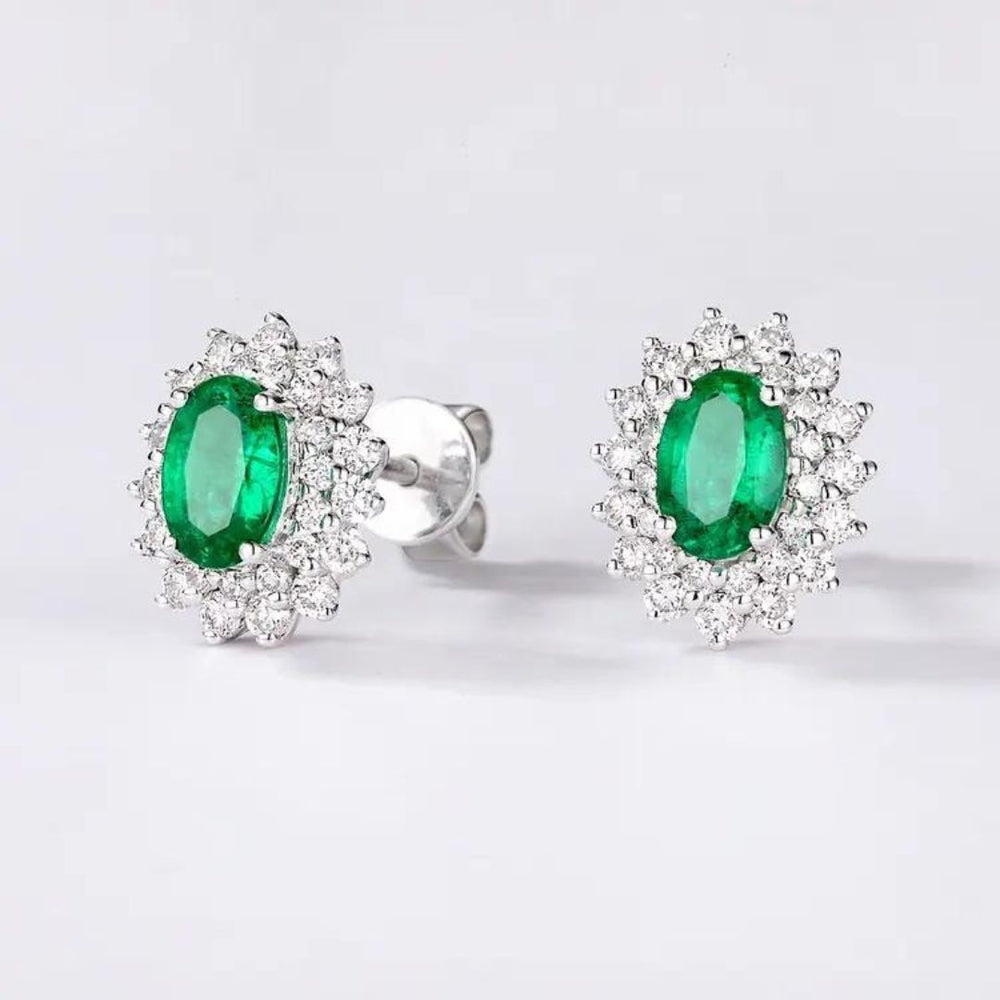 The earrings feature vivid green emeralds and lab-grown diamonds set in 18K white gold. The diamonds are environmentally sustainable and offer great value for money. The earrings are ethically sourced, UK hallmarked, handcrafted, and feature conflict-free diamonds. The main stone is an oval-shaped emerald paired with lab-grown diamonds, with a total diamond weight of 0.50 carats. The earrings have dimensions of 13mm x 9mm, with the emerald size being 7mm x 5mm. The setting is claw-set and the diamonds are of H/Si quality. The earrings are nickel-free and provide options for lab-grown or mined diamonds.