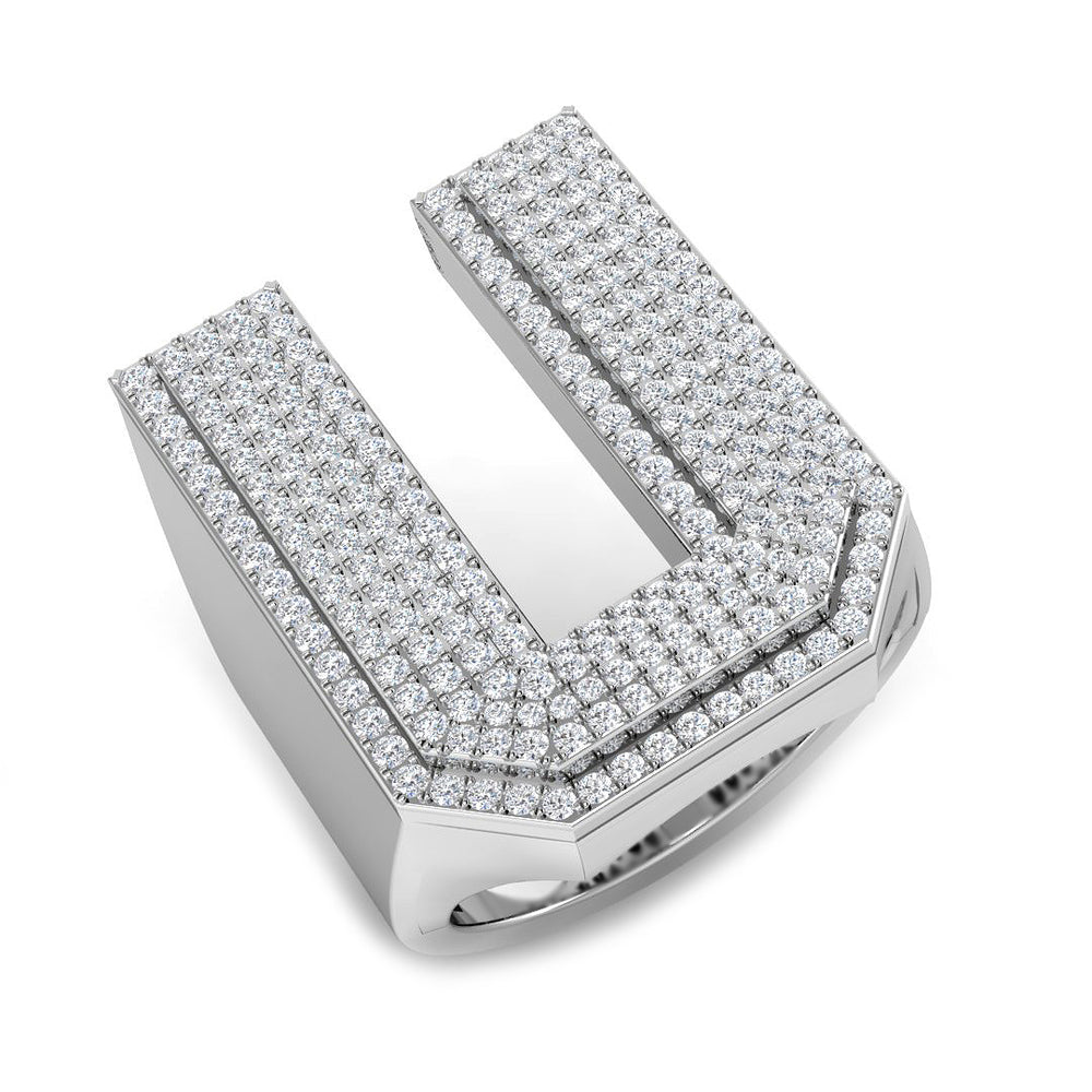 Attirez tous les regards avec cette bague initiale audacieuse et étincelante de 1,30 carat, ornée d'un grand U serti de diamants ronds brillants. Sa silhouette plate et son anneau large en font une pièce remarquable, idéale pour celles et ceux qui souhaitent afficher fièrement leur nom, leur identité ou leur initiale avec éclat.