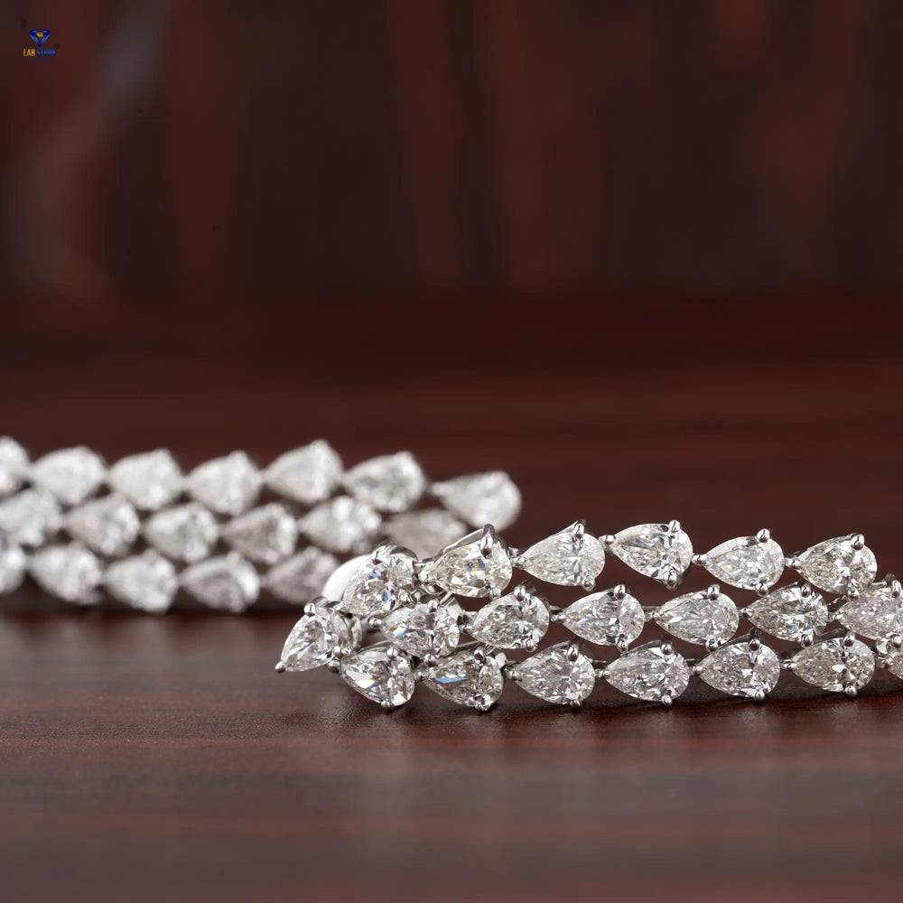 Elegantly crafted with 10.00 Carat Lab Created Pear Shape Diamonds, these Chandelier Earrings will elevate any look. The F/VS grade ensures sparkling brilliance, while the eco-friendly Lab Grown Diamonds add a touch of ethical luxury. Set in 18k Gold and Platinum for lasting beauty.