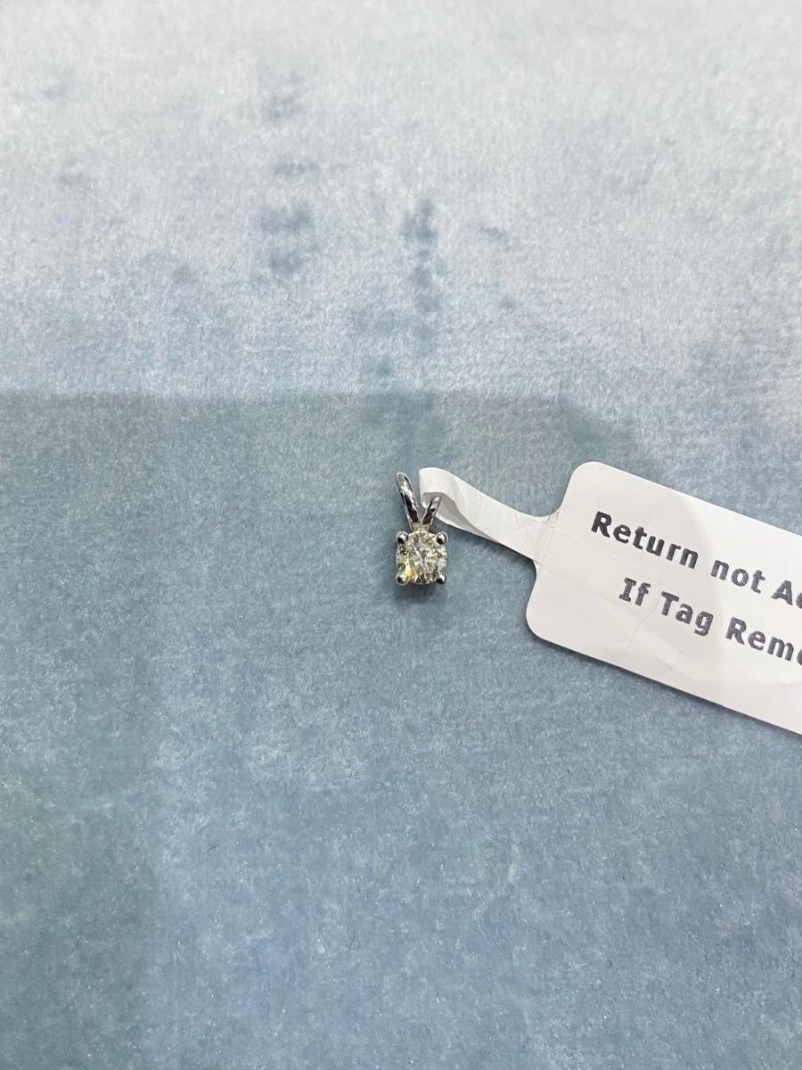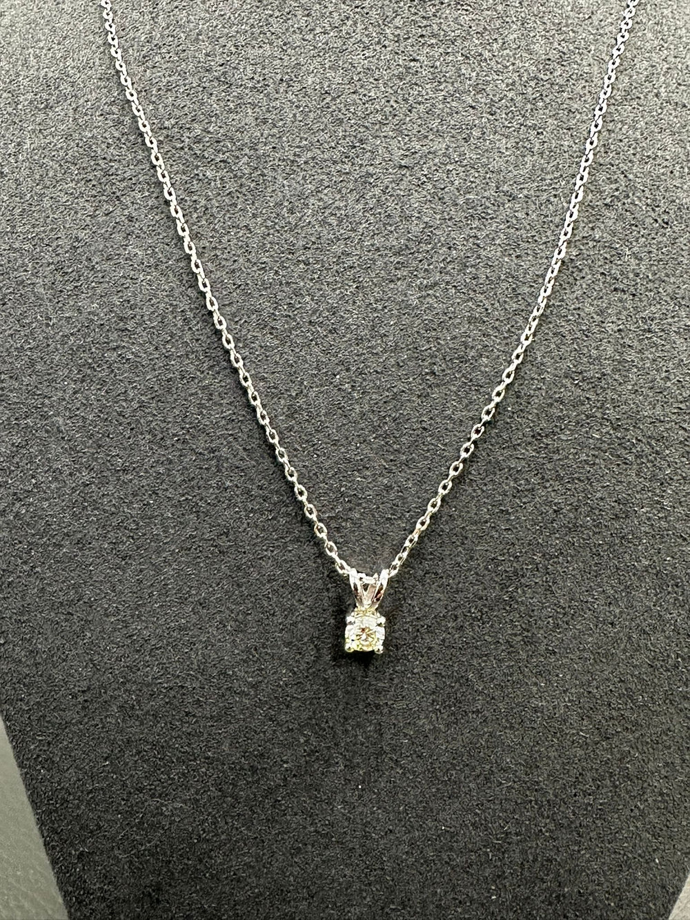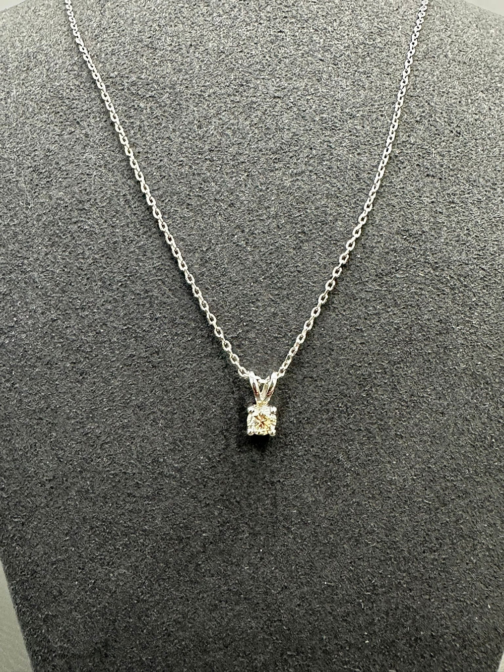 Découvrez l'élégance raffinée de ce pendentif solitaire en or blanc 14 carats , orné d'un diamant naturel de 0,33 carat. Le diamant rond brillant est serti avec soin par un sertissage classique à quatre griffes , assurant une réflexion optimale de la lumière et un éclat exceptionnel.