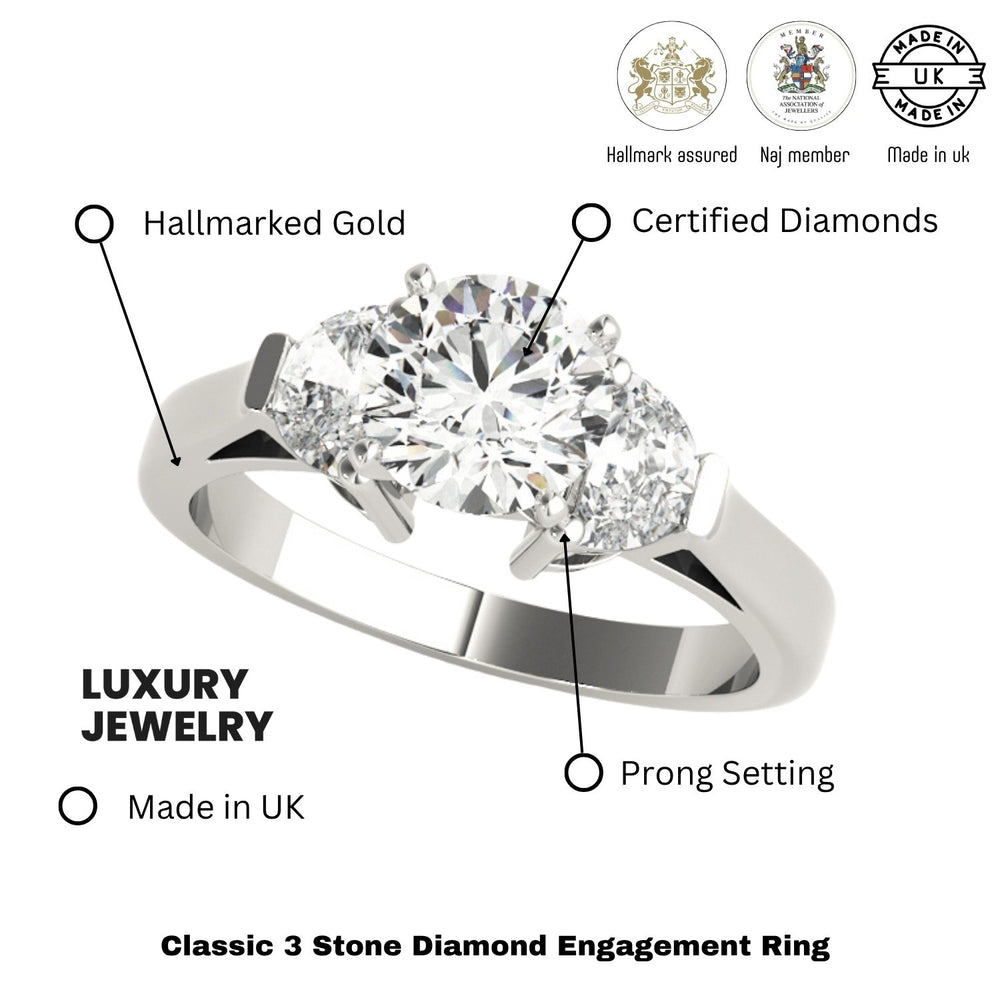 💍 Product Overview – Round Cut Trilogy Engagement Ring with Half Moon Side Diamonds