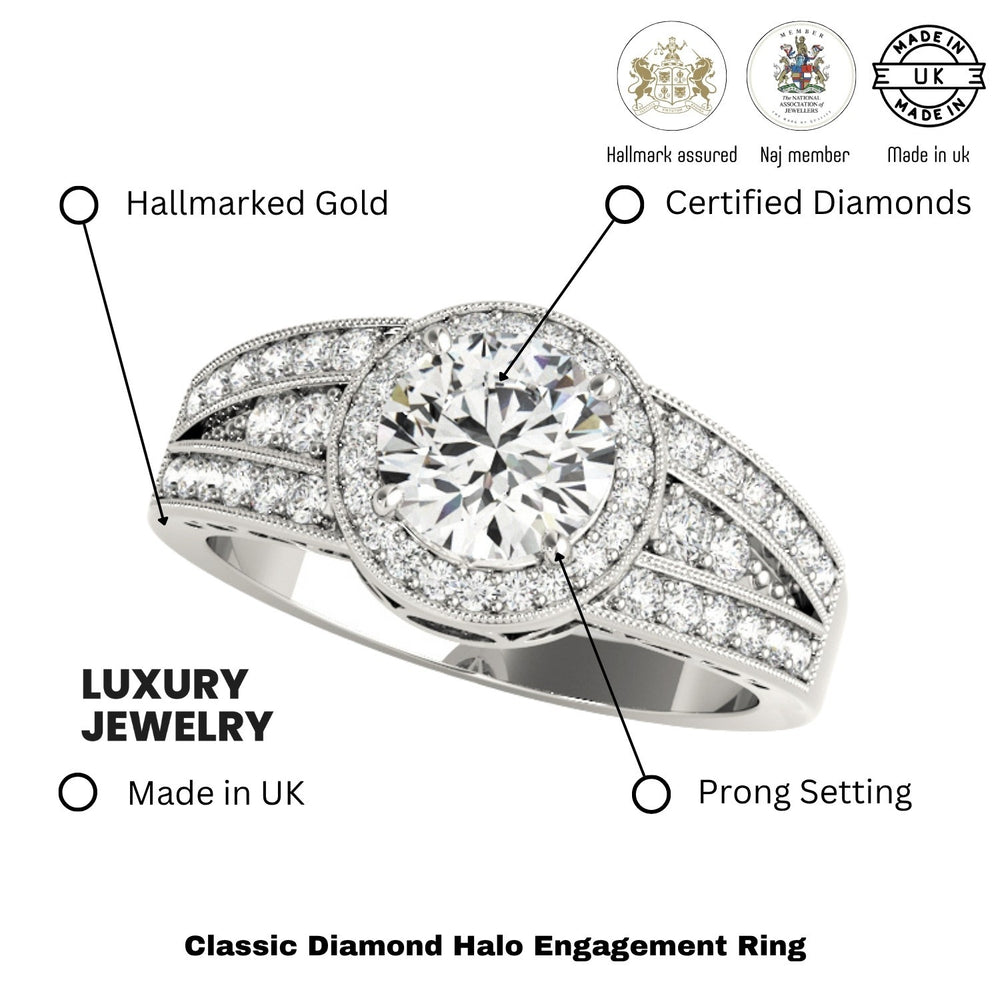 Disponibles en or blanc, jaune ou rose 9K et 18K , ou en platine , avec un poids total de diamants allant de 0,50 ct à 2,00 ct , chaque bague est fabriquée à la main au Royaume-Uni et poinçonnée par le Bureau d'analyse du Royaume-Uni pour garantir sa qualité et son authenticité.