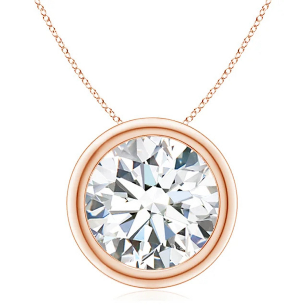 Discover timeless elegance with our exquisite Bezel-Set Round Diamond Solitaire Pendant Necklace. This captivating piece features a brilliant round diamond, meticulously set within a sleek and modern rose gold bezel. The bezel setting not only offers exceptional security for your precious diamond but also creates a clean, contemporary silhouette that enhances the stone's natural radiance.