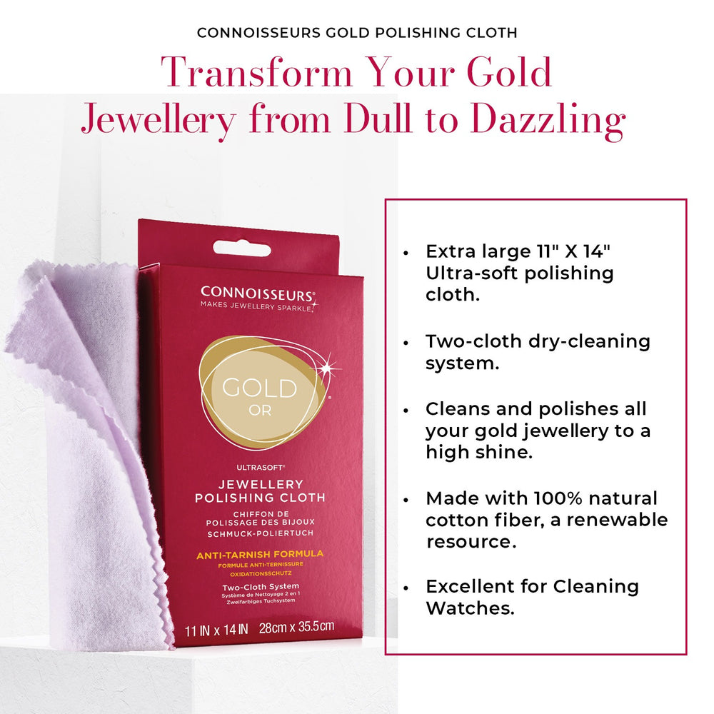 Crafted from 100% natural cotton fibre, this extra-large 11” x 14” polishing cloth features Connoisseurs’ exclusive two-cloth dry-cleaning system. The inner cloth gently removes tarnish and surface impurities, while the outer cloth polishes gold to a radiant, mirror-like shine.