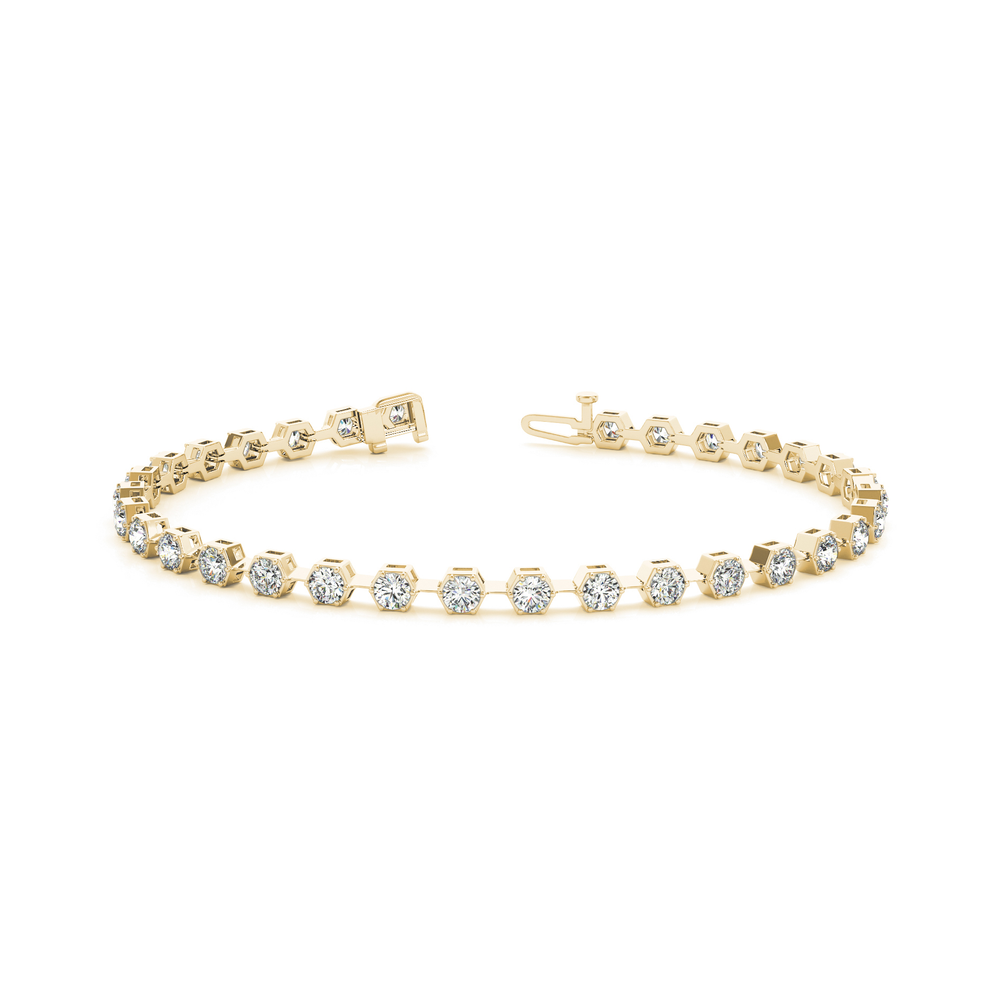 Add a touch of luxury to your collection with this hexagon style prong-set diamond tennis bracelet, beautifully crafted in your choice of 9K or 18K Yellow, White, Rose Gold, or Platinum. This modern and elegant bracelet features round brilliant diamonds, each set within a sleek hexagonal bezel frame, offering a striking geometric design with timeless sophistication and brilliance.