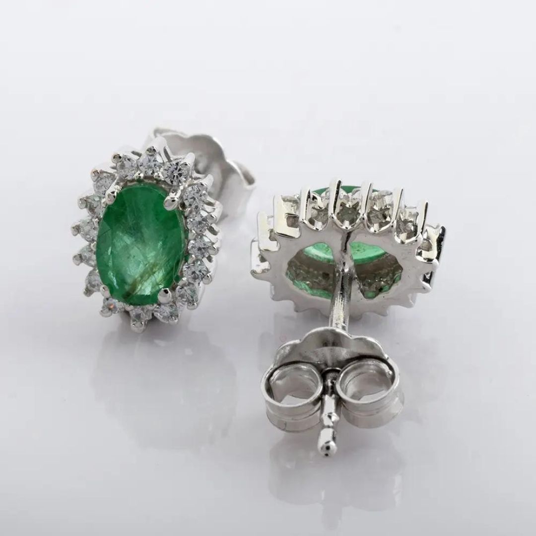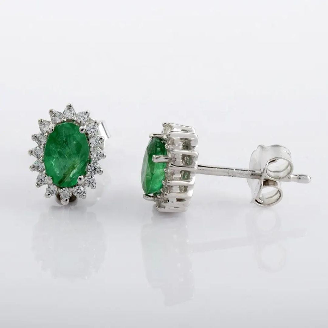This text describes a pair of earrings crafted by master jewellers, featuring emeralds and lab-grown diamonds set in 18K white gold. The earrings are designed to be both visually stunning and environmentally sustainable. The specifications include details such as the total diamond weight, dimensions, main stone type (emerald and lab-grown diamond), gem information, diamond quality, metal type, setting style, and ethical considerations like conflict-free diamonds and being nickel-free. The text also mentions the option to choose between lab-grown diamonds or certified mined diamonds, highlighting the benefits of each choice in terms of sustainability and value.