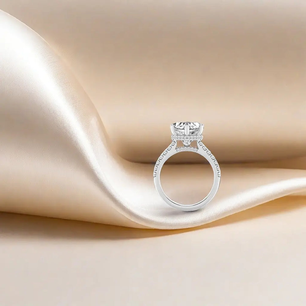 Découvrez l'élégance intemporelle de notre bague de fiançailles sertie d'un diamant cœur de laboratoire et d'un halo discret. Le diamant cœur, créé en laboratoire, attire tous les regards, entouré d'un halo invisible et de pierres latérales, le tout serti griffes pour une sécurité optimale. Confectionnée en or 18 carats et platine, cette bague rayonne d'amour et de luxe.