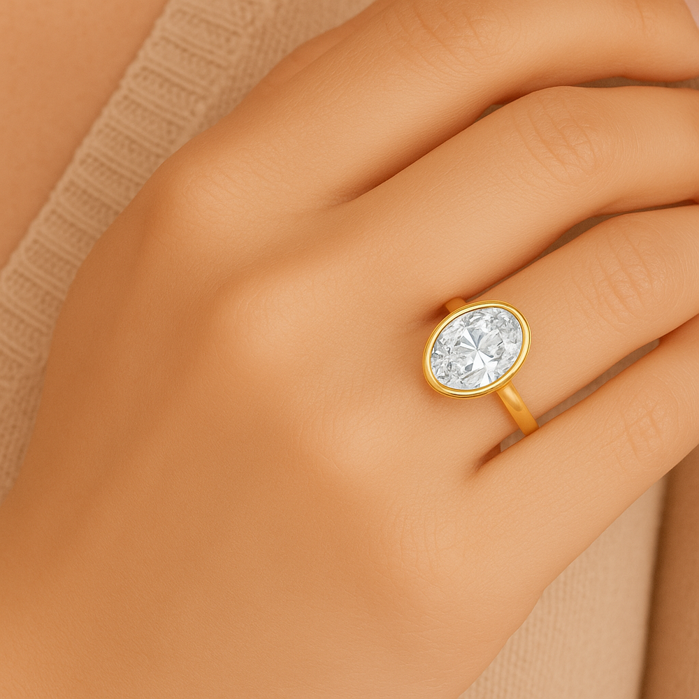 Celebrate love with the Lab-Grown Diamond Solitaire Engagement Ring, featuring a stunning oval diamond with bezel setting in D color and VVS clarity. Available in 0.50Ct to 2.00Ct and crafted in 9K or 18K white, yellow, rose gold, or platinum, it’s timeless, elegant, and sustainable.