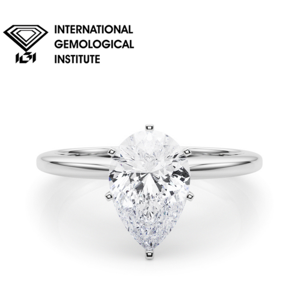 Célébrez l'amour avec la bague de fiançailles solitaire en diamant de laboratoire , ornée d'un magnifique diamant poire serti 6 griffes, de couleur D et de pureté VVS . Disponible de 0,50 ct à 2,00 ct et réalisée en or blanc, jaune ou rose 9 ou 18 carats, ou en platine , elle est intemporelle, élégante et écoresponsable.