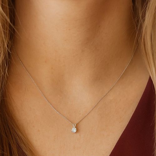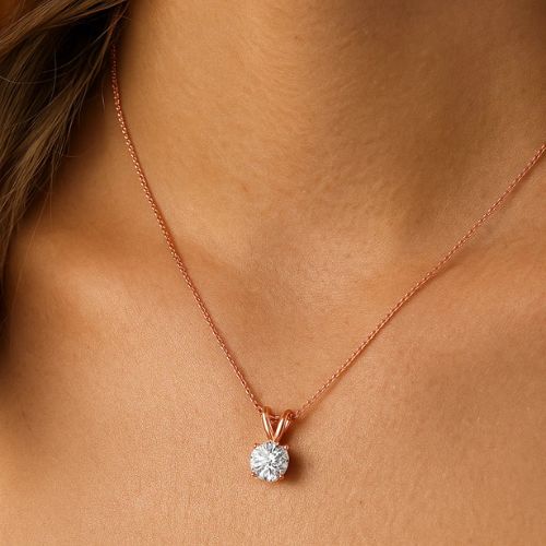 This exquisite pendant features a brilliant round lab-grown diamond, securely set in a classic prong setting to maximize sparkle and light reflection. The sleek V-bale design allows it to hang gracefully from your favorite chain, creating a timeless silhouette perfect for everyday wear or special occasions.